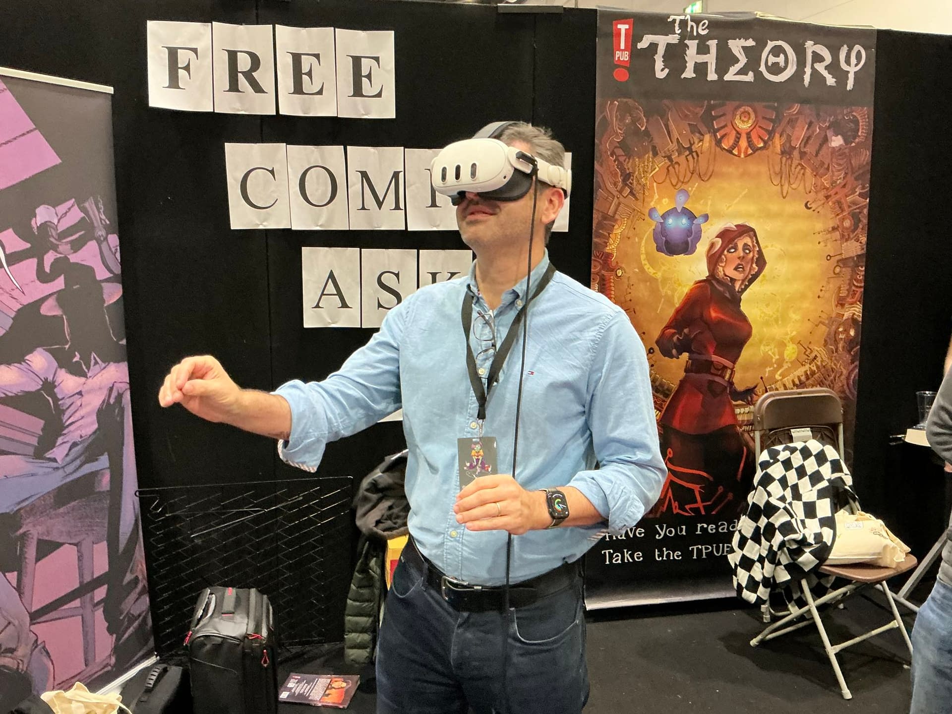 Neil Gibson's Twisted Comics debuted a new virtual reality comic book reader, which not only gives you a comic book to read, floating in front of you, but also builds an interactive environment around you, reflecting details of the comic book as it plays out, and you can wander through it, returning to the page. These are the folks with the Black Mirror comic book license folks, it may have infected them more than we realised.