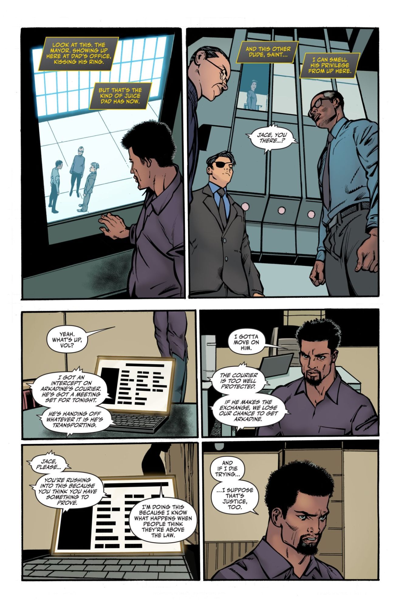 Drama is unfolding all around in this preview of Next Batman: Second Son #2, in stores from DC Comics next week. And that drama has translated into lots of preview images that have significantly reduced the required word count for this article. Yay! You got Lucius Fox dealing with being in charge of all of Bruce Wayne's assets. Tim Fox realizing his dad's drama could be connected to his own drama. And Batwing engine in more typical Bat-family super-heroics, which is to say beating the crap out of low-level criminals in search of information. All that and more in this issue, hitting stores on Tuesday. Check out the preview below.