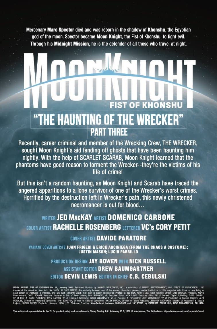 - Cover image for 75960620928601421 MOON KNIGHT: FIST OF KHONSHU #14 JUAN FRIGERI FROM THE CHAOS A COSTUME VARIANT, by Jed MacKay & Domenico Carbone, in stores Wednesday, November 5, 2025 from Marvel