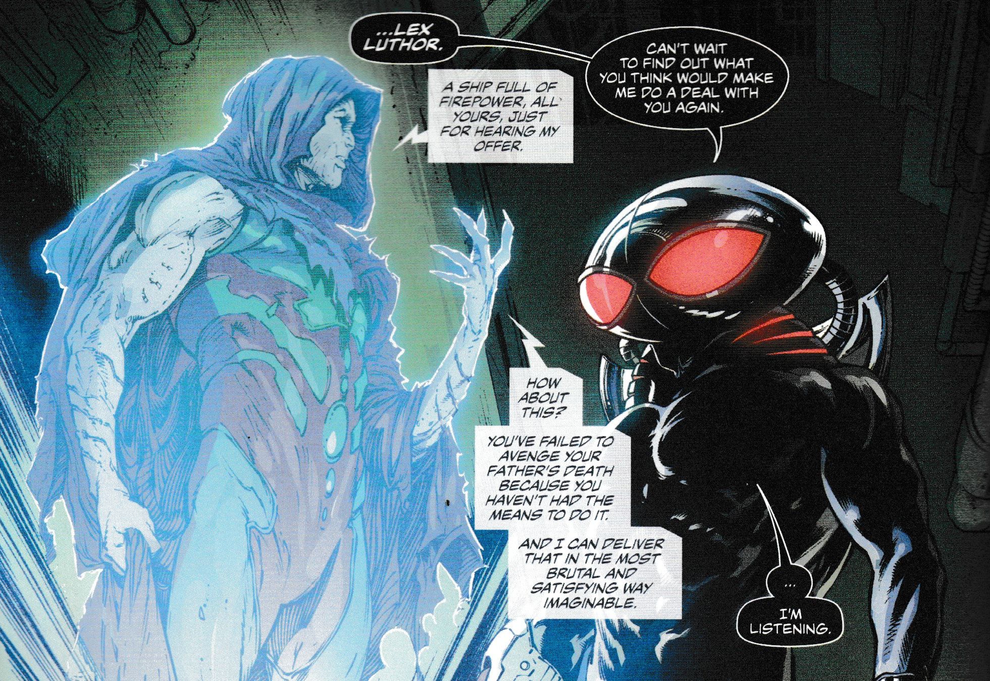 Aquaman #50 has a longer, more involved deal with the drone, finding its way to Black Manta. And an 'ends' offered to Black Manta by Luthor. But the means are still a mytsery.