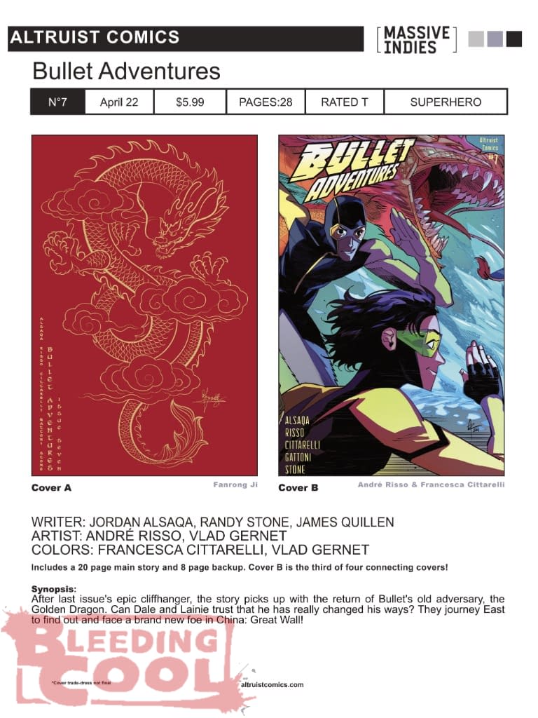 After last issue's epic cliffhanger, the story picks up with the return of Bullet's old adversary, the Golden Dragon. Can Dale and Lainie trust that he has really changed his ways? They journey East to find out and face a brand new foe in China: Great Wall! Cover A features a traditional Chinese Dragon drawn in gold over a red background by Chinese artist JI Fanrong. $5.99 4/22/2026