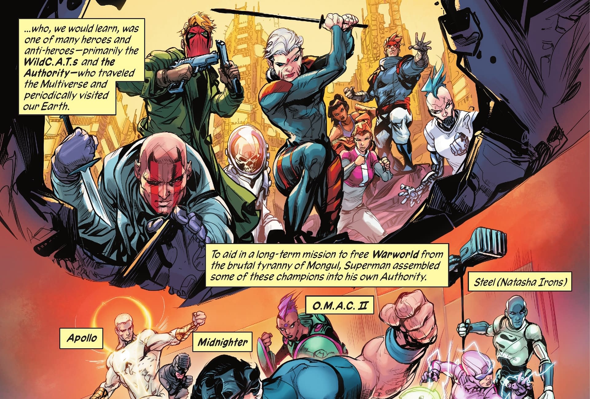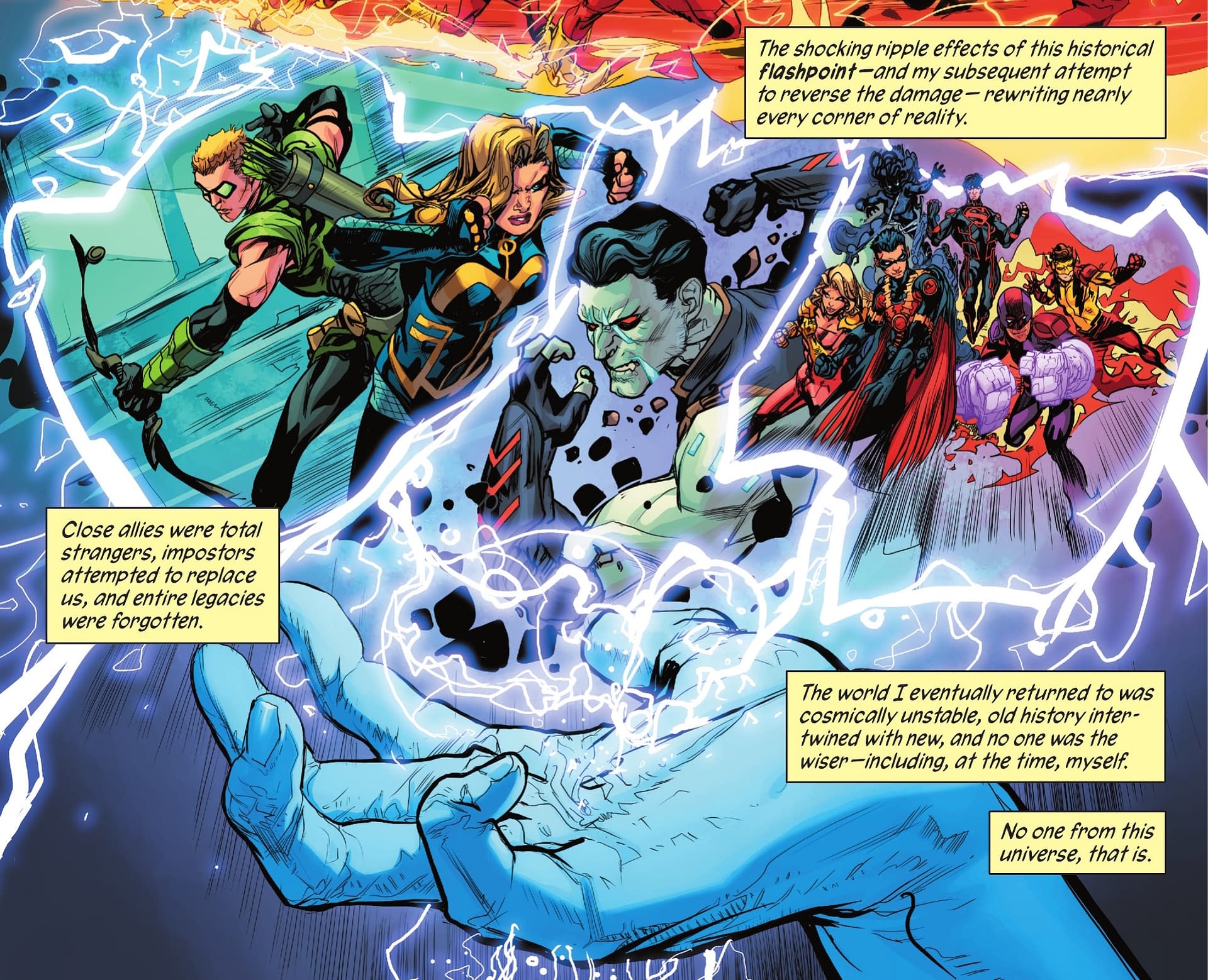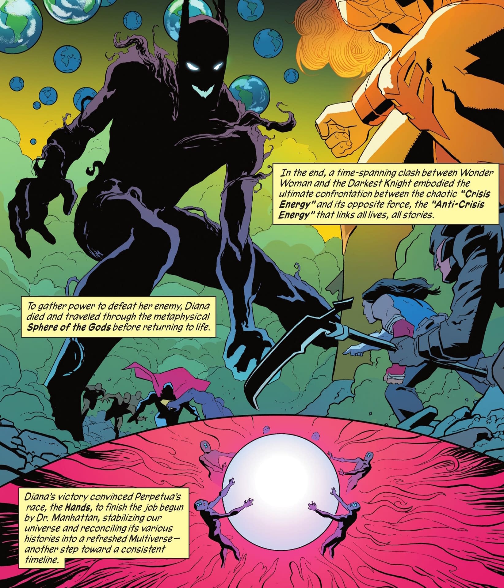 And the Wildstorm Universe of characters, blatantly missing in previous issues, including the whole war between Daemonites and Kheribim, makes for a panel, despite previously having been embedded in the history of the DC Universe with Team Seven, Stormwatch and the rest. And the Absolute Universe, currently tied in with the DC's K.O. crossover somewhat…