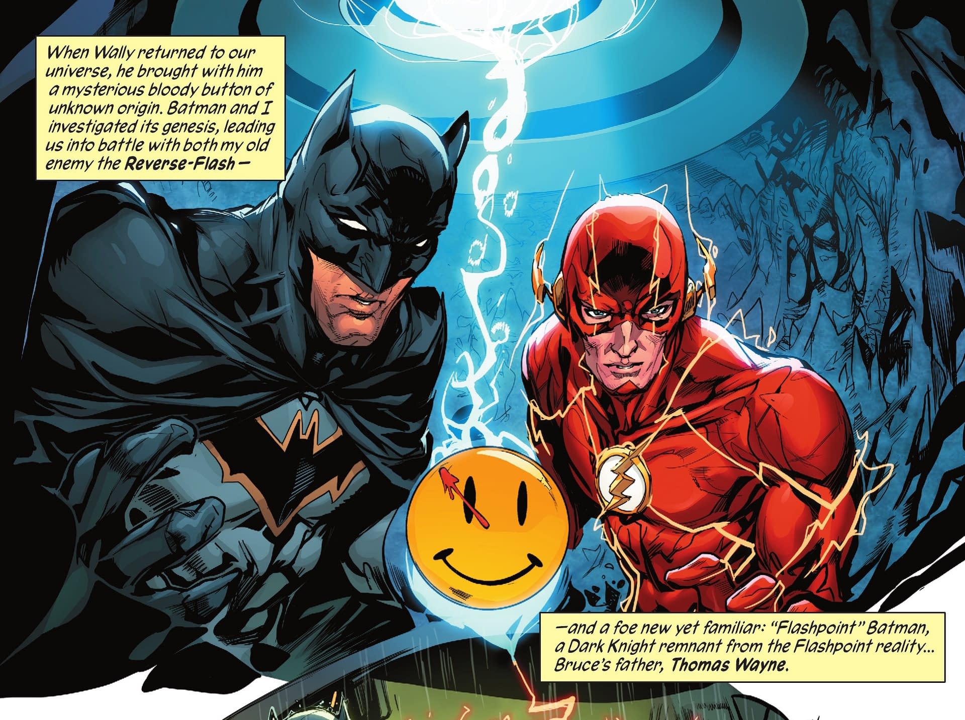 …Wally West finds the bloodied button, courtesy of the Comedian being murdered (or was he) by Ozymandias…