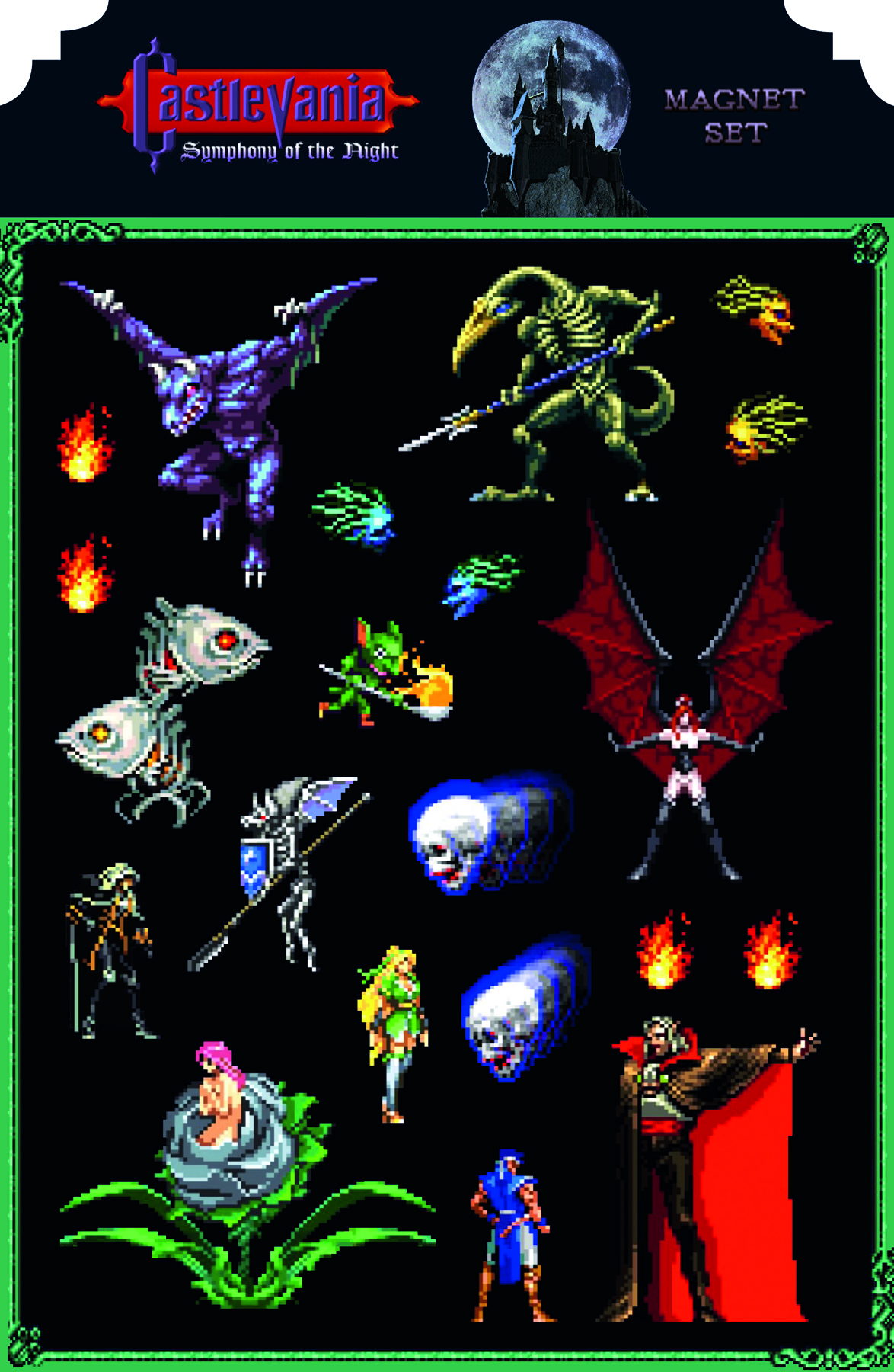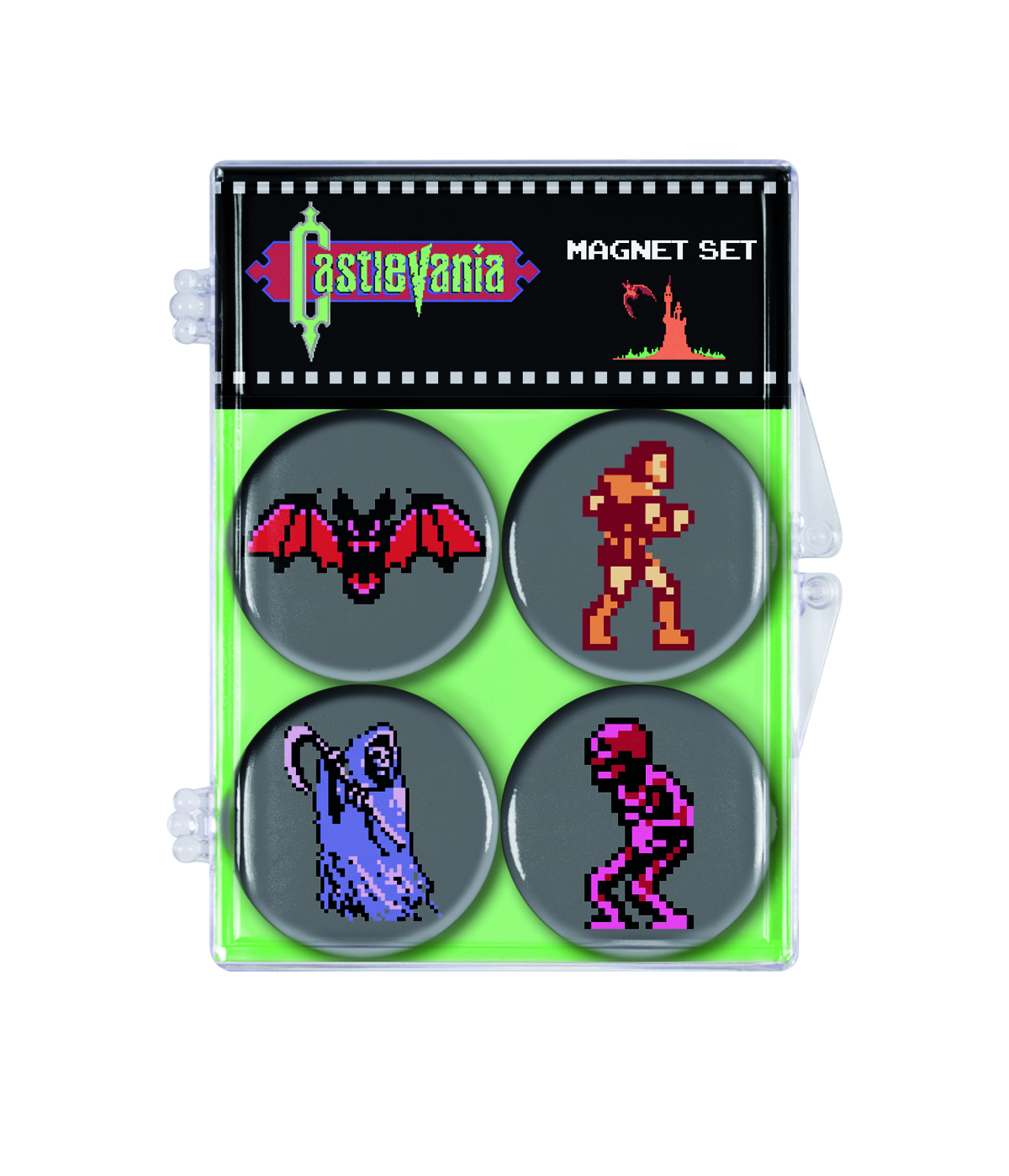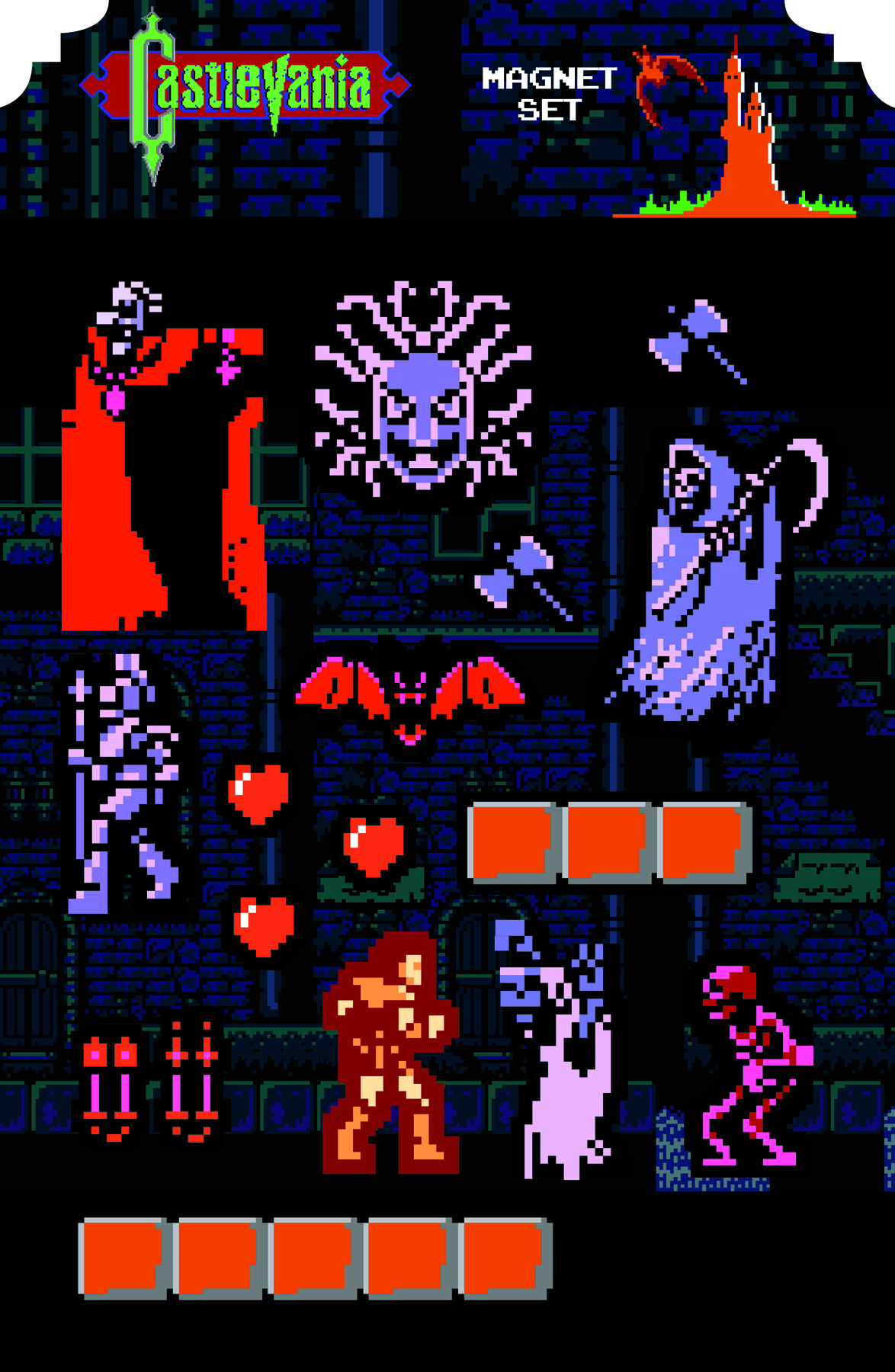 Our magnet features Simon Belmont, Count Dracula, and other monsters along with floor blocks to recreate moments remembered from this classic!