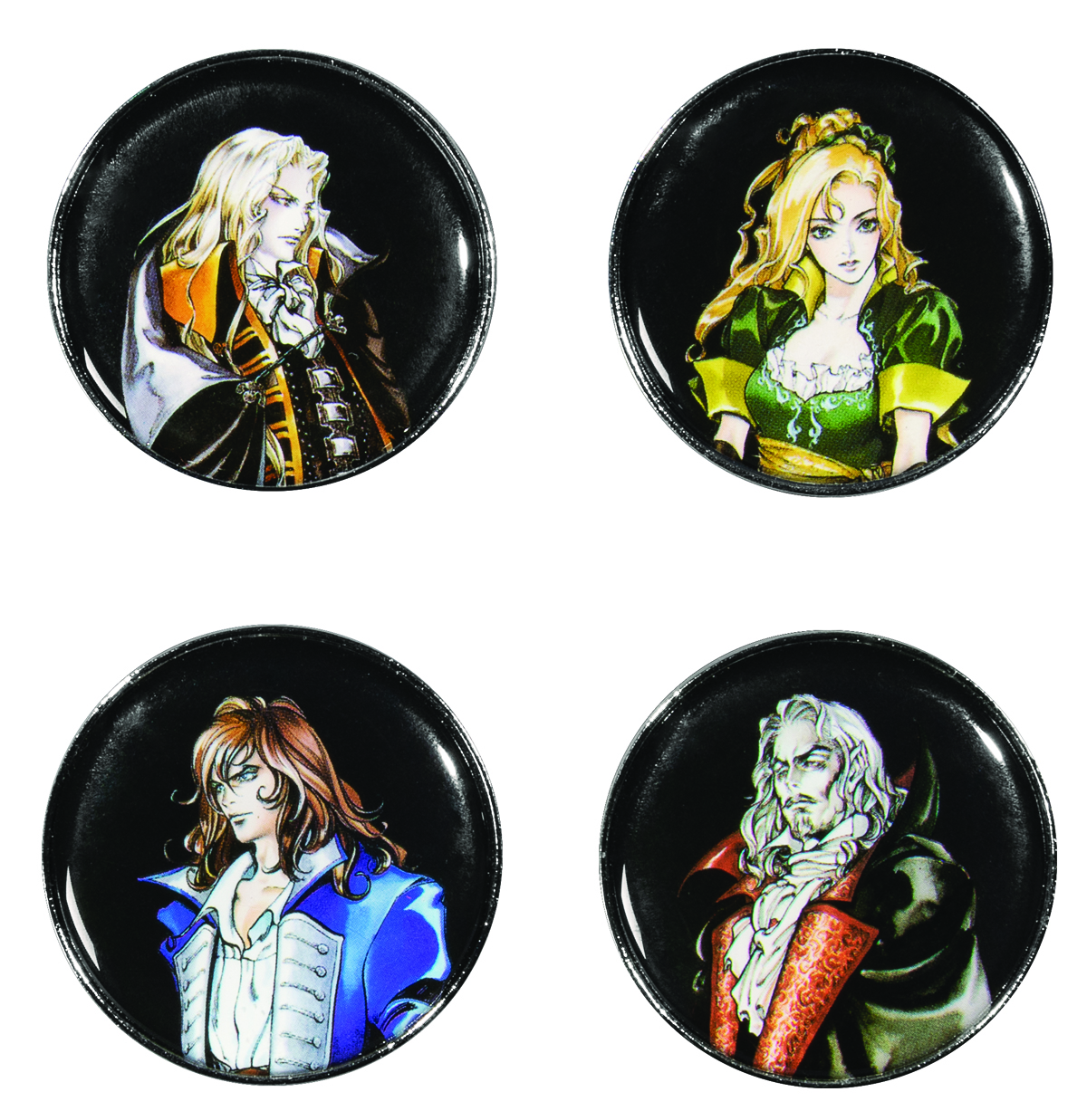 Four 1.5" pins inspired by the gorgeous portrait art of Alucard, Richter Belmont, Maria Renard, and Count Dracula himself.