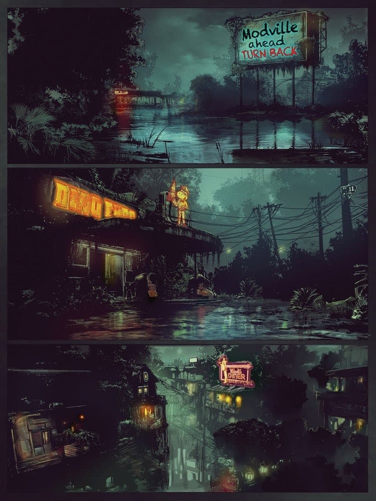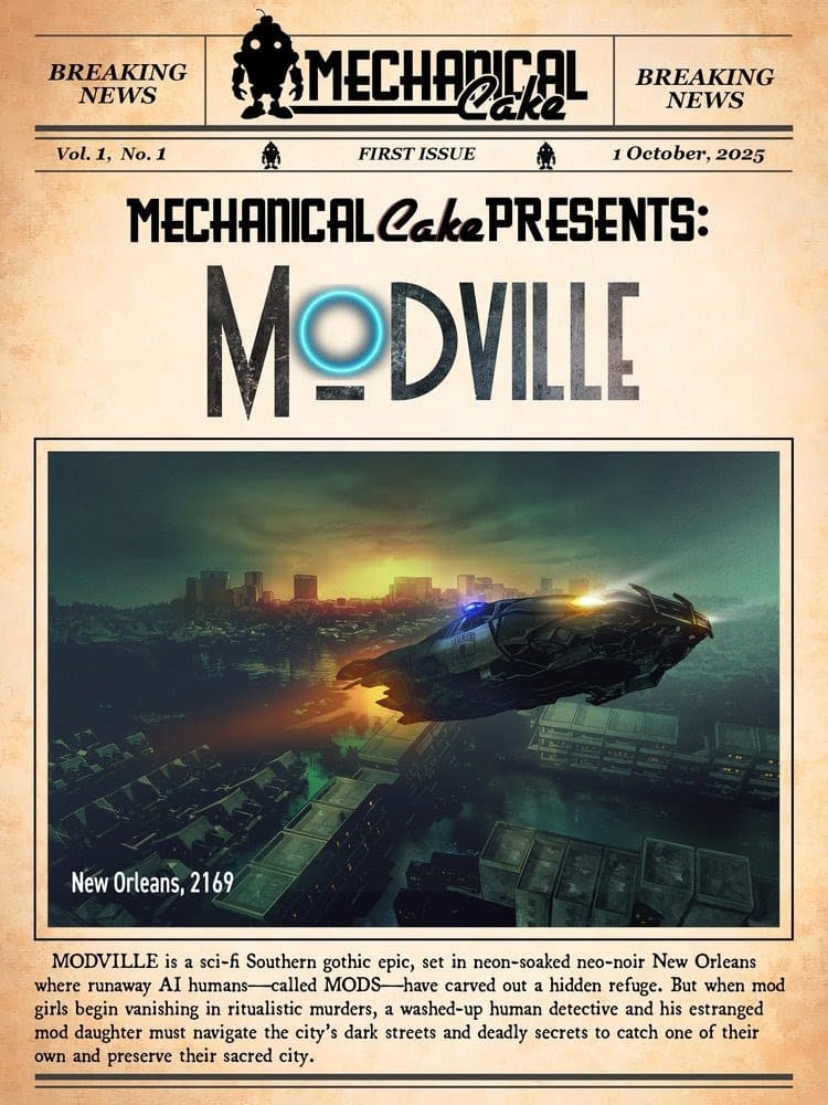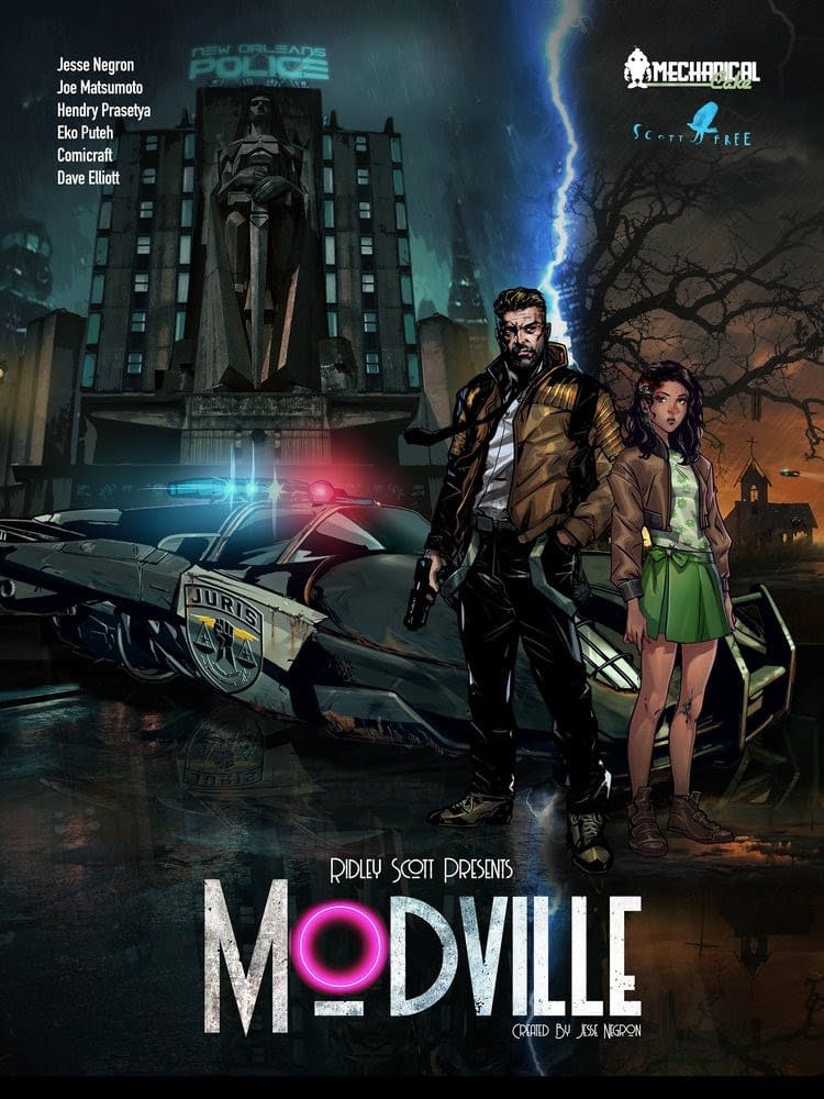 Modville is a Sci-Fi/Southern Gothic crime drama involving AI humans ("mods") in future New Orleans. Created by Jesse Negron, written by Jesse Negron and Joe Matsumoto, line art by Hendry Prasetya, colour art by Eko Puteh, lettering by Comicraft's Tyler Smith, Publisher and Editor Dave Elliott, CEO Mechanical Cake Tom Sanders, SVP Scott Free, Tom Moran, poster art by Bill Sienkiewicz.