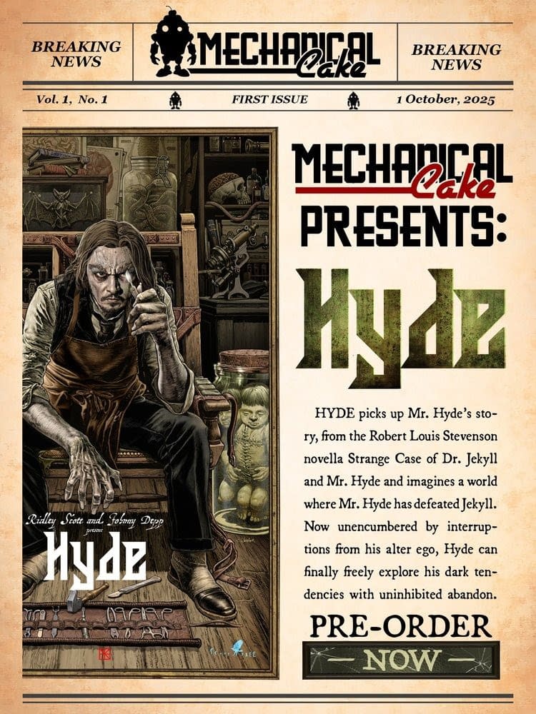 Mechnical Cake likes the names of their comic books to be on the short side. Modville breaks the trend by being a whole two syllables, followed by Hyde and Nick. And we have some new previews of the three series of graphic novels currently being prepared by the team, including Ridley Scott, Johnny Depp and Dave Elliott. With the news that Hyde Chapter One is due to ship in April 2026…