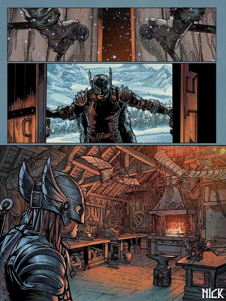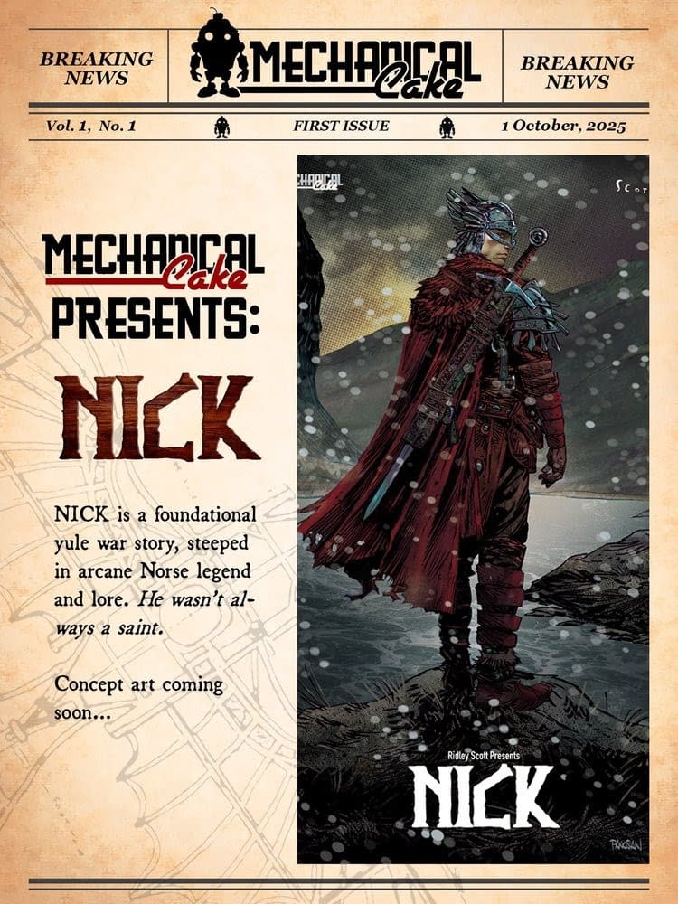 Nick is a foundational Yule war story, steeped within the arcane Norse legends, a very Viking version of Santa Claus. Mechanical Cake is a new comic publisher with Dave Elliott as Publisher/Editor in Chief, Jesse Negron as CEO, and Ridley Scott and comic book artists Bill Sienkiewicz, Chris Weston, Dan Panosian, Brian Rood, and Hendry Prasetya creating three series of graphic novels, Modville, Hyde, and Nick.