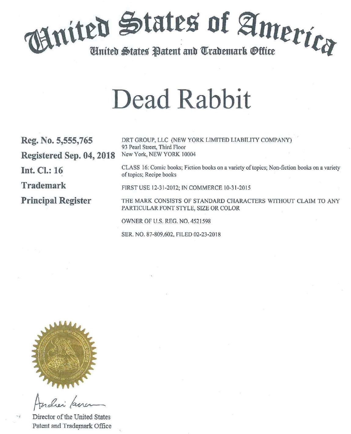 In September, the US government approved a trademark registration by DRT for 'Dead Rabbit' to cover "Comic books; Fiction books on a variety of topics; Non-fiction books on a variety of topics; Recipe books."