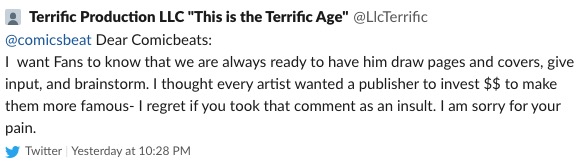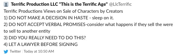 Meanwhile, Terrific Production LLC, presumably seeing what Liefeld has been going through, took to Twitter with some advice for all creators thinking of selling their characters:
