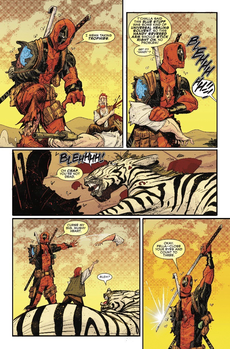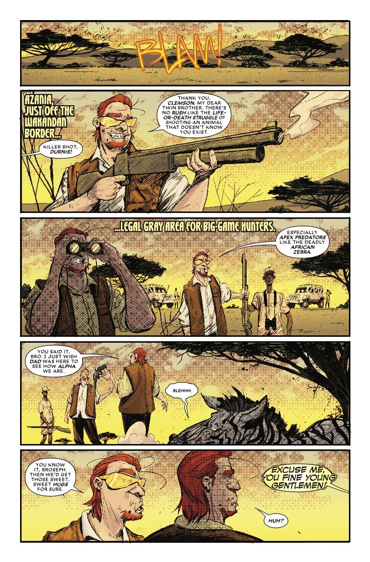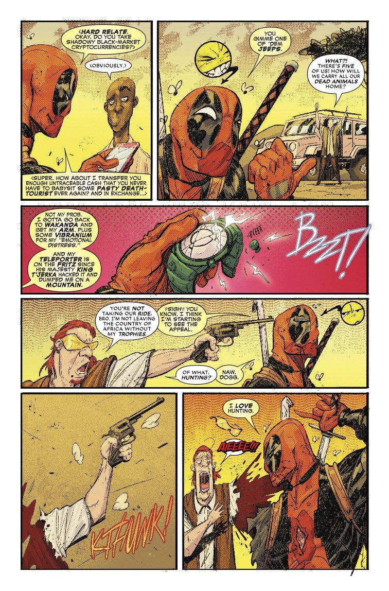 And in next week's Black Panther vs. Deadpool #2, the book goes beyond matters of life and death to explore political topics, such as the ethics of trophy hunting, a favored sport of rich douchebags. Deadpool runs into a few of these after being teleported to the desert by the Panther in the series' first issue, and before he makes quick work of the poachers, he first explores the socio-political ramifications of the trade on the local economy.