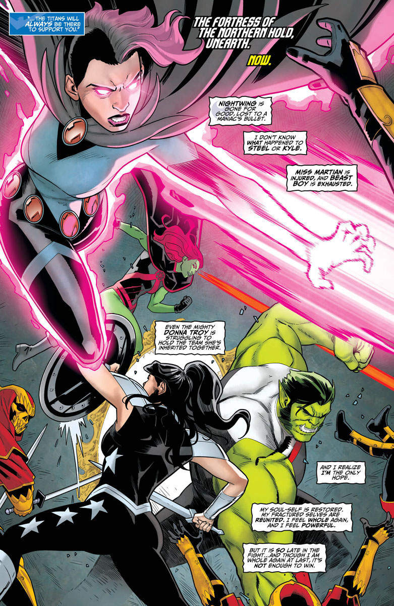 "Into the Bleed" finale! It's all been building to this! Witness the battle for the fate of the entire Multiverse as our heroes tackle Mother Blood and her armies of Unearth! Mother's plan to use the Bleed to spread her power throughout every corner of the fabric of reality has reached its zenith, and she's pulling out all the stops to see to it the Titans fail in stopping her. But even with Raven's soul-self reunited, can the team rescue their heavy hitters Kyle Rayner and Steel before it's too late? Don't miss this melee of multiversal mayhem!