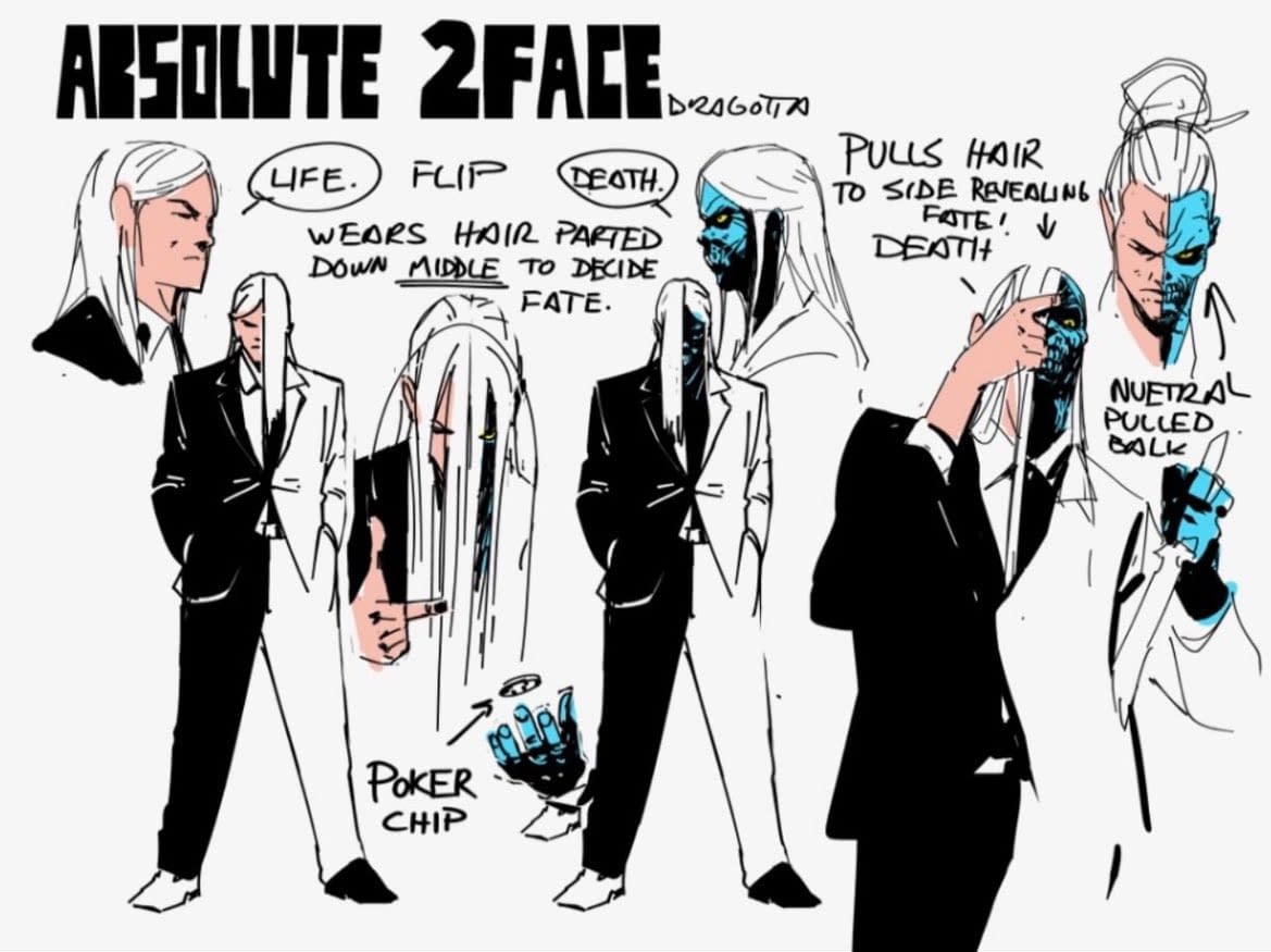 And Nick Dragotta has his designs for those to share as well. "Absolute Two Face. Flipping hair and coins. Maybe my favorite design of the bunch. Shout out Bill Finger and Bruce Timm."