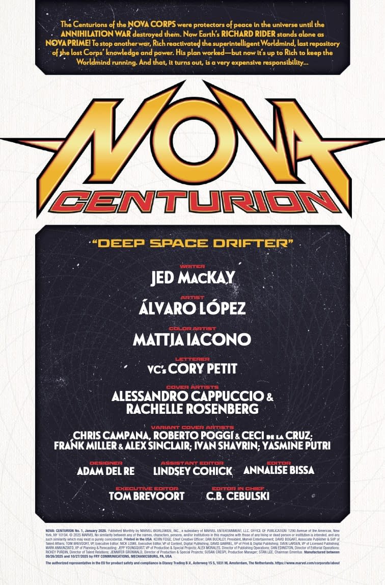 - Cover image for 75960620922400111 NOVA: CENTURION #1 ALESSANDRO CAPPUCCIO COVER, by Jed MacKay & Alvaro Lopez & Alessandro Cappuccio, in stores Wednesday, November 19, 2025 from Marvel