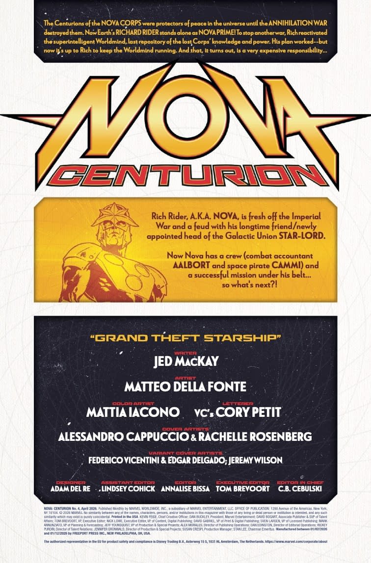 - Cover image for 75960620922400411 NOVA: CENTURION #4 ALESSANDRO CAPPUCCIO COVER, by Jed MacKay & Alvaro Lopez & Alessandro Cappuccio, in stores Wednesday, February 4, 2026 from Marvel