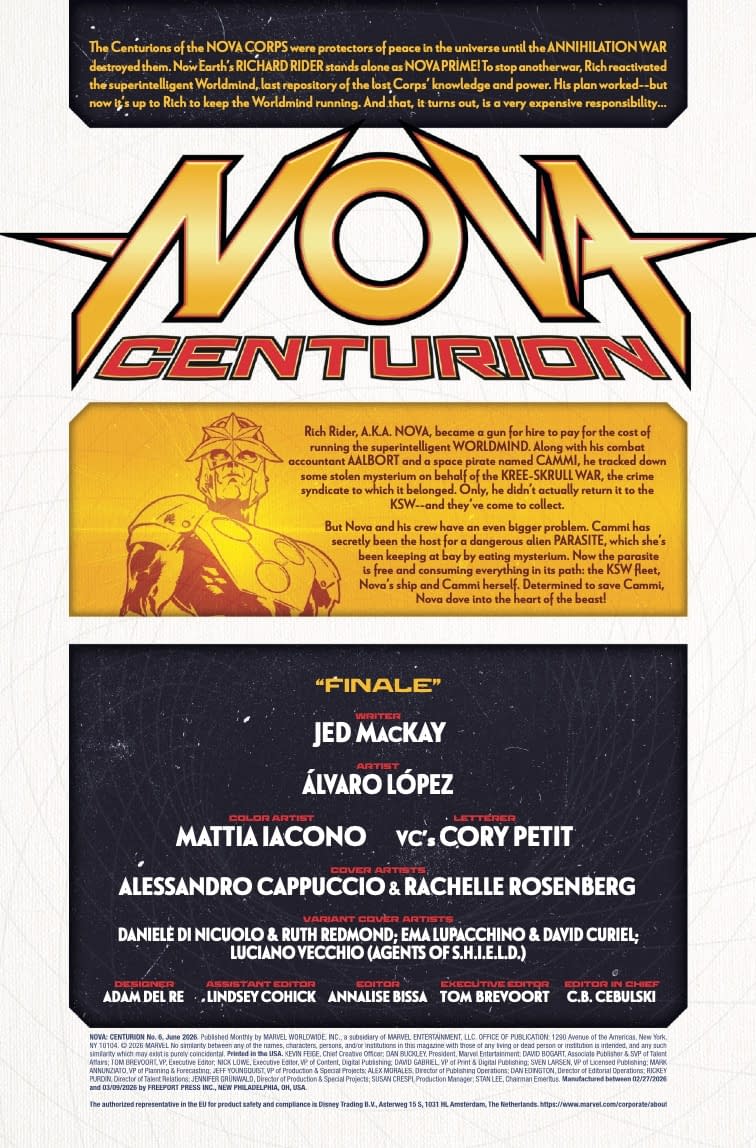 - Cover image for 75960620922400611 NOVA: CENTURION #6 ALESSANDRO CAPPUCCIO COVER, by Jed MacKay & Alvaro Lopez & Alessandro Cappuccio, in stores Wednesday, April 1, 2026 from Marvel