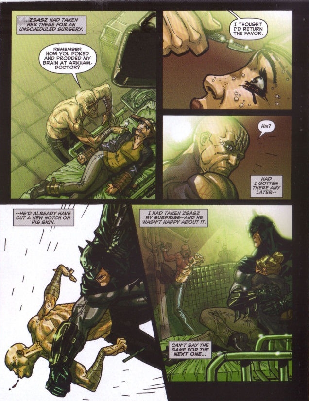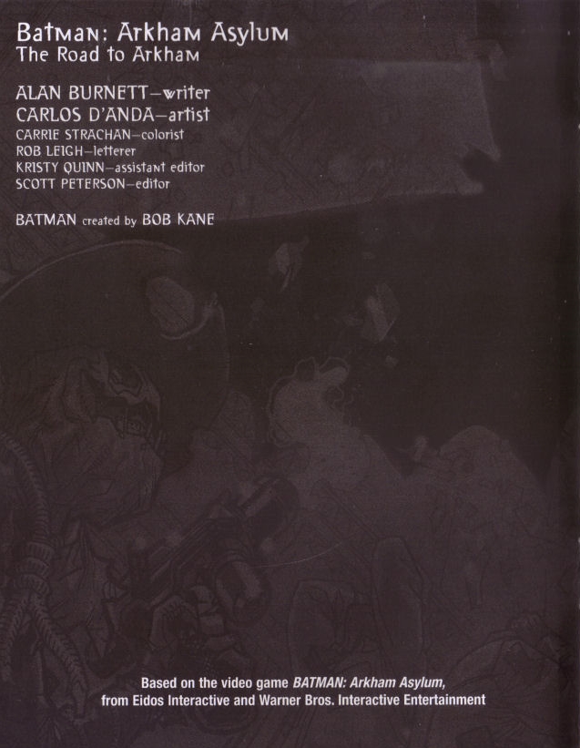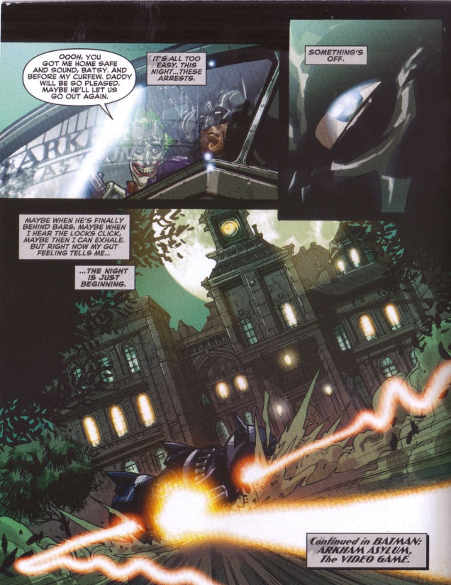 The comic is a direct prelude, ending literally where the game starts. In addition, Burnett sets up Zsasz's position in the game as the first villain Batman encounters, as well as Scarecrow (the villain in Burnett's Super Friends episode "The Fear") and Joker's major roles in the game. Clues are also left for Bane's over drugged status and Harley's position as the Joker's insider already in Arkham. A nod is also made to Warden Sharpe's eventual mayor-ship in Arkham City and that Black Mask is in Bludhaven menacing Nightwing. The comic is a near-perfect prelude, hitting on many key points in the game without them seeming forced, with great characterization and focus in just 12 pages. As the first comic book entry in the Arkham Video Game Universe, it is a fantastic effort, with moody and fantastically detailed art from D'Anda that would carry over into Arkham City.