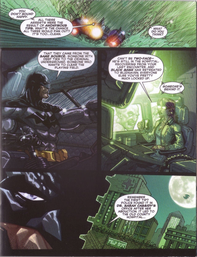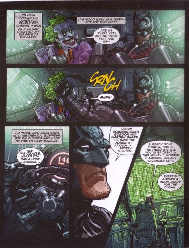 Starting mere moments before the game is to begin, the comic finds Batman racing a captured Joker to Arkham Asylum in the Batmobile. After silencing the Joker, Batman and Oracle confer over the radio about the three captures Batman has recently made, all from anonymous tips.
