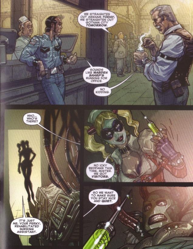 Meanwhile, Arkham Asylum Warden Sharpe and Commissioner Gordon prepare to receive the Joker at Arkham Asylum. Also, "nurse" Harley Quinn prepares for the Joker to arrive too, by giving Bane an injection, just as the Batmobile arrives at the Asylum.