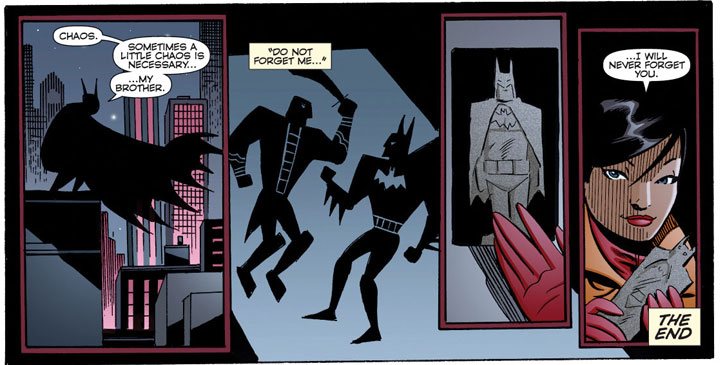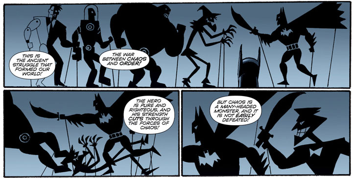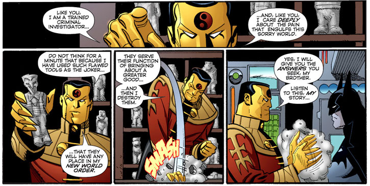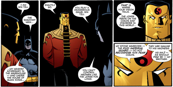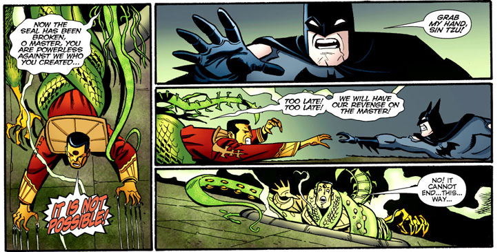 Believing they are brothers, Sin Tzu reveals why he was using the Gotham City villains and believing Batman to be a pure agent of order like himself tries to recruit him. Batman refuses, and in their ensuing battle, supernatural forces Sin Tzu has kept controlled end up loose, consuming the villain.