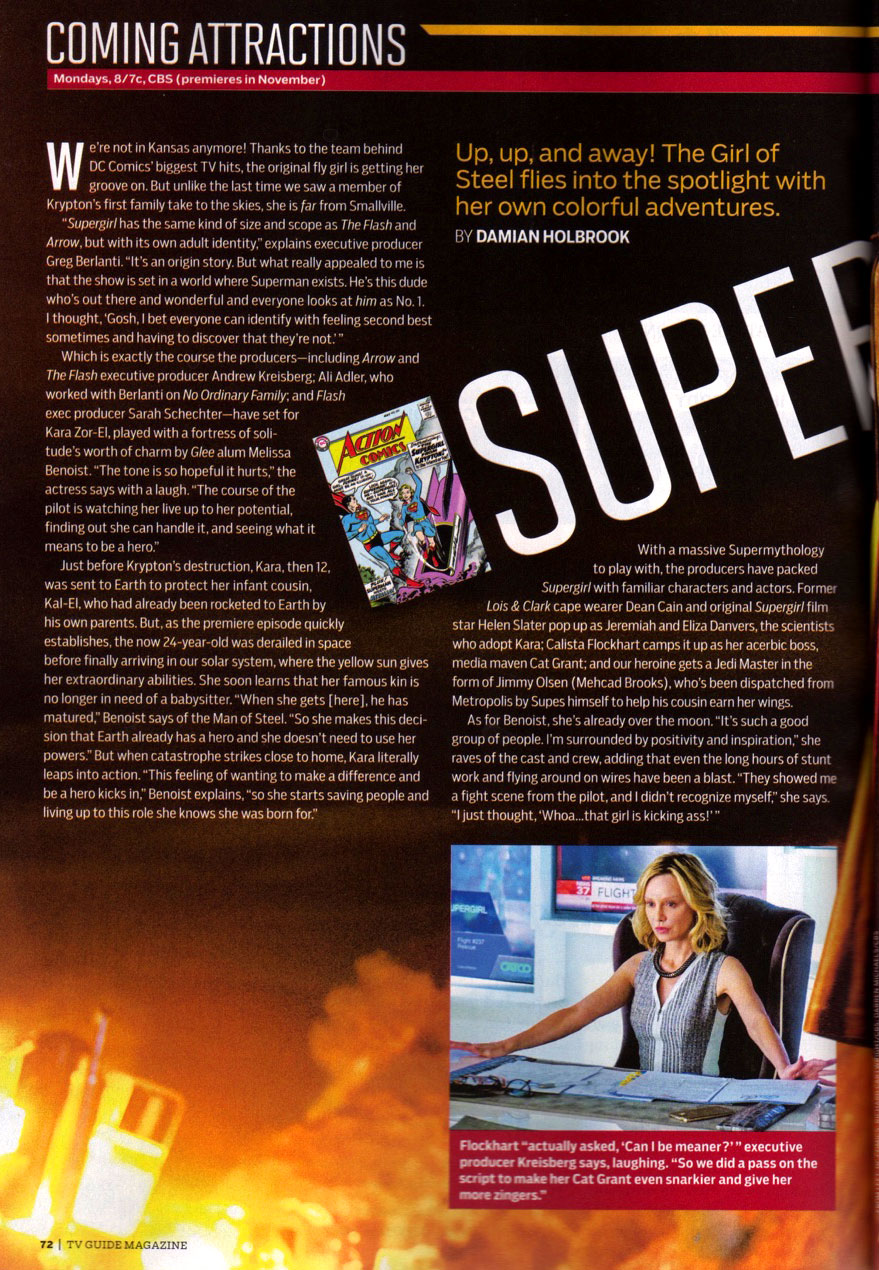 Greg Berlanti, Andrew Kreisberg, and Ali Adler brought the Maiden of Steel to CBS in November of 2015, placing the show on a different Earth from Arrow but still allowing for multiverse crossovers between the three shows, which increased once Supergirl moved to the CW for season 2. As the 2015 San Diego Comic-Con neared, TV Guide released its annual Comic-Con Special, something they'd been publishing since 2010. This go-around included a preview article for the Supergirl series and the first story set in the new Supergirl series, a special four-page comic book story.
