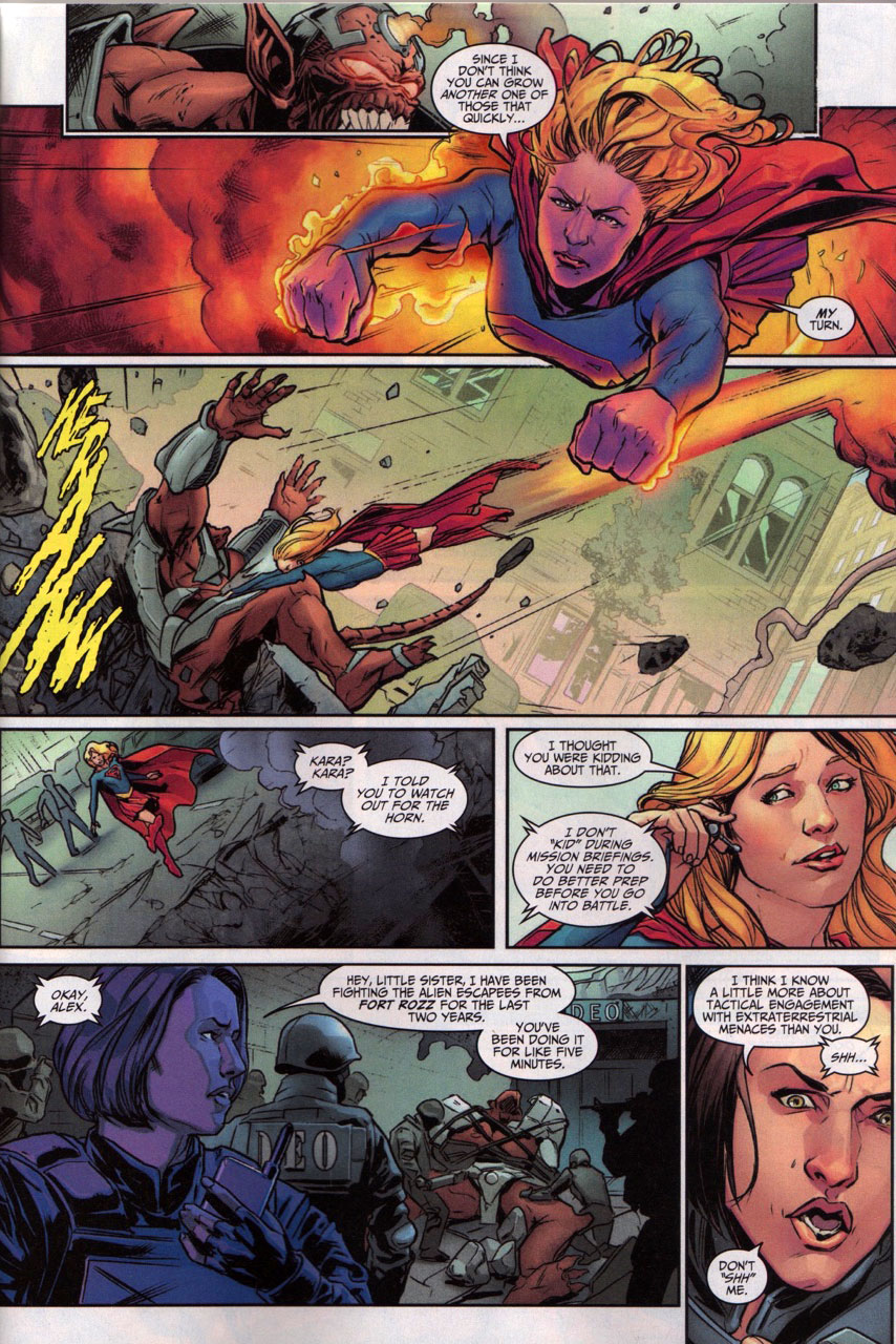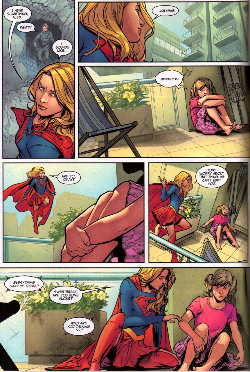 Supergirl then hears crying in the distance, and after shhing Alex over their communication devices, goes to find a young girl names Tracy nearby hiding. The girl tells Supergirl that her sister is supposed to be back soon, but the alien scuffle scared her, and Tracy worries her sister may not come back. Staying calm and positive, Supergirl comforts Tracy and reminds the eavesdropping Alex sisters are always there for each other. When Tracy's big sister rushes in to find Tracy safe, Supergirl departs and challenges Alex to a race home.