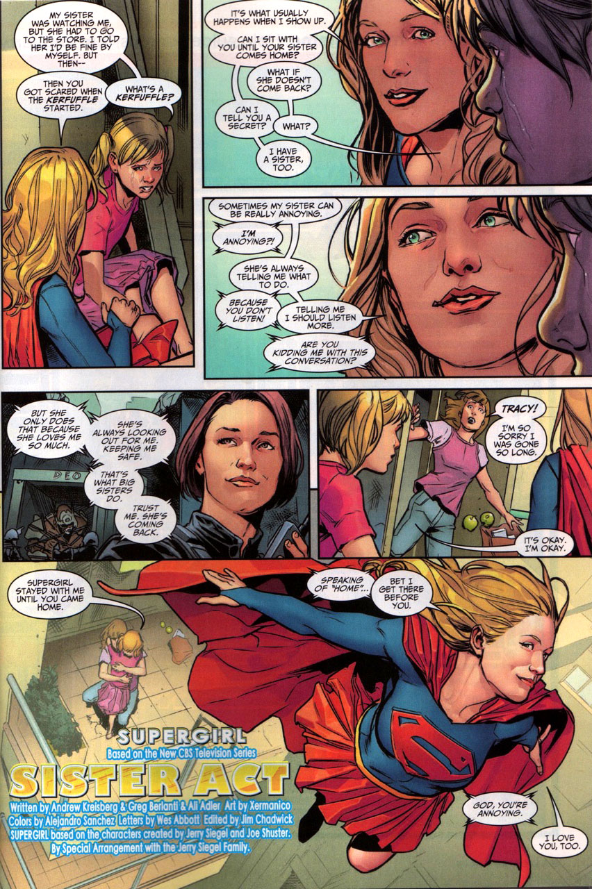 Serving as the first story set in the new Arrowverse show, "Sister Act" was written by show developers Greg Berlanti, Andrew Kreisberg, and Ali Adler with art by Xermanico. The story begins with Supergirl pursuing an alien escape from Fort Rozz, whose explosive horny projectile looks like it might prove to be a problem for the Maiden of Steel. However, she emerges from the explosion unharmed and subdues her opponent, while Alex, Supergirl's adoptive sister, lectures her on listening more when it comes to dealing with the alien escapes.