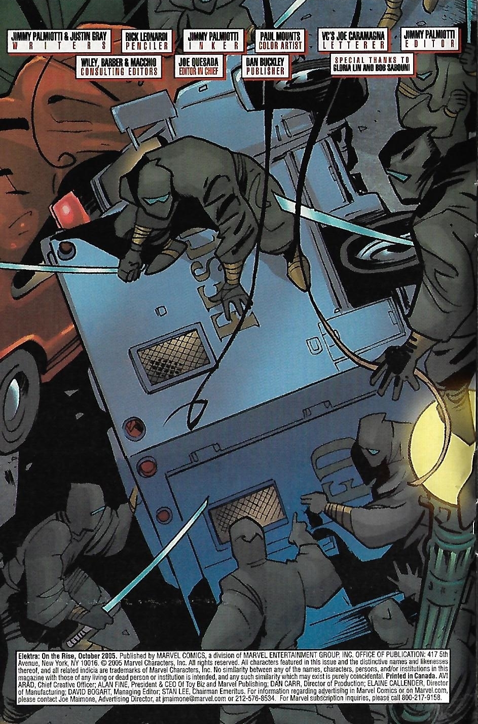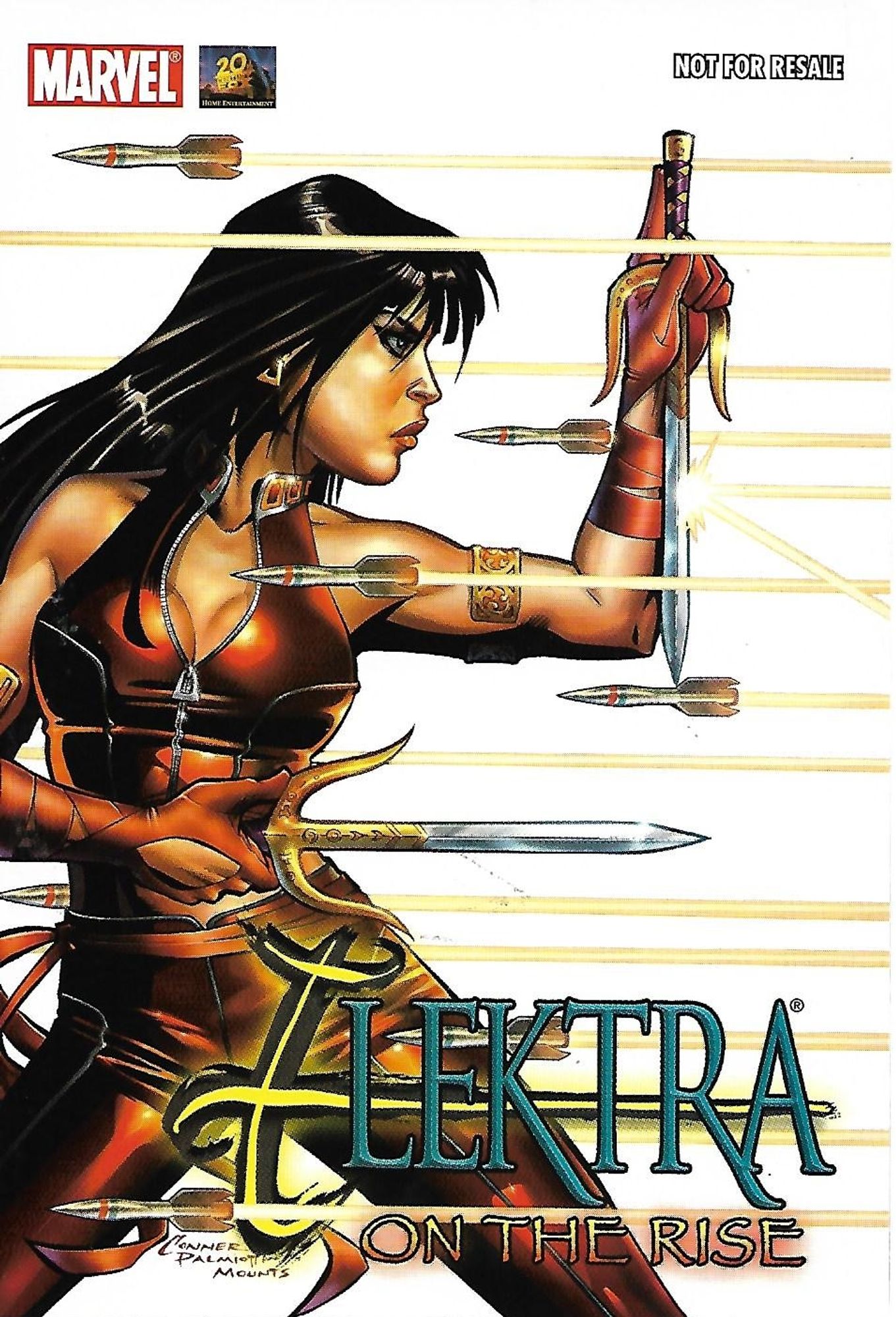 Following on their earlier team-up on a Marvel movie tie-in comic, Blade Nightstalking, Jimmy Palmiotti and Justin Gray wrote Elektra On the Rise. Like Blade Nightstalking, the comic serves as a prequel to the movie explaining how Elektra went from her "death" in Daredevil to alive and well again in the Elektra movie. The comic shows how Stick rescued her body from the Hand, and she comes back to life with him watching over her.