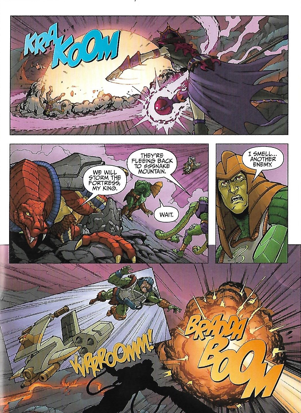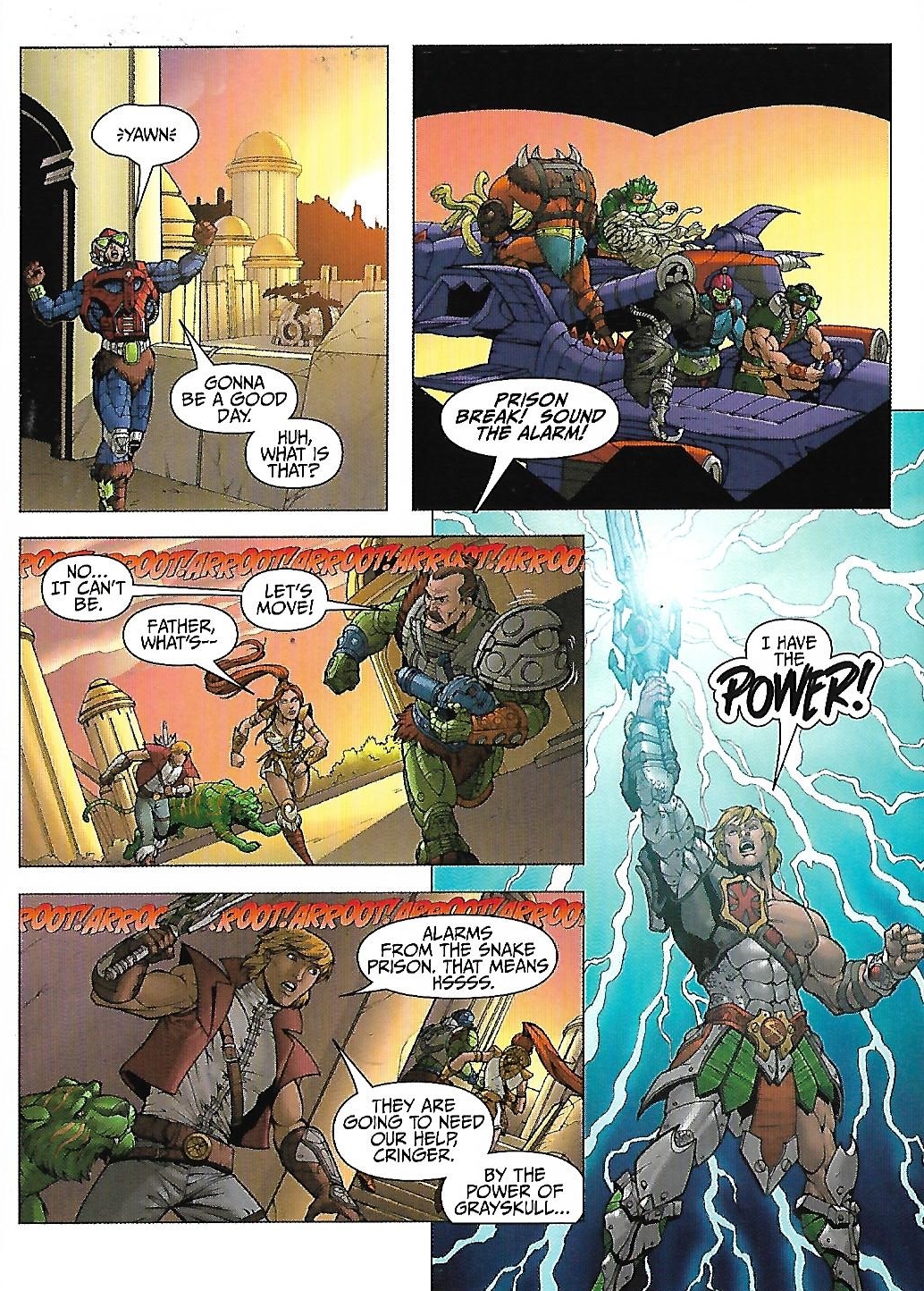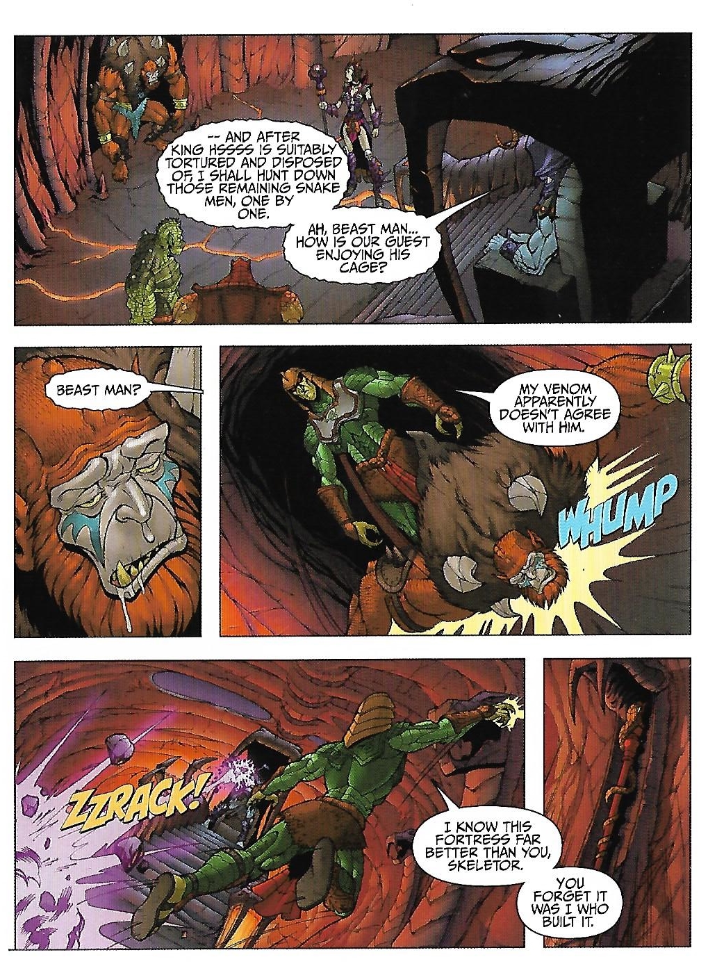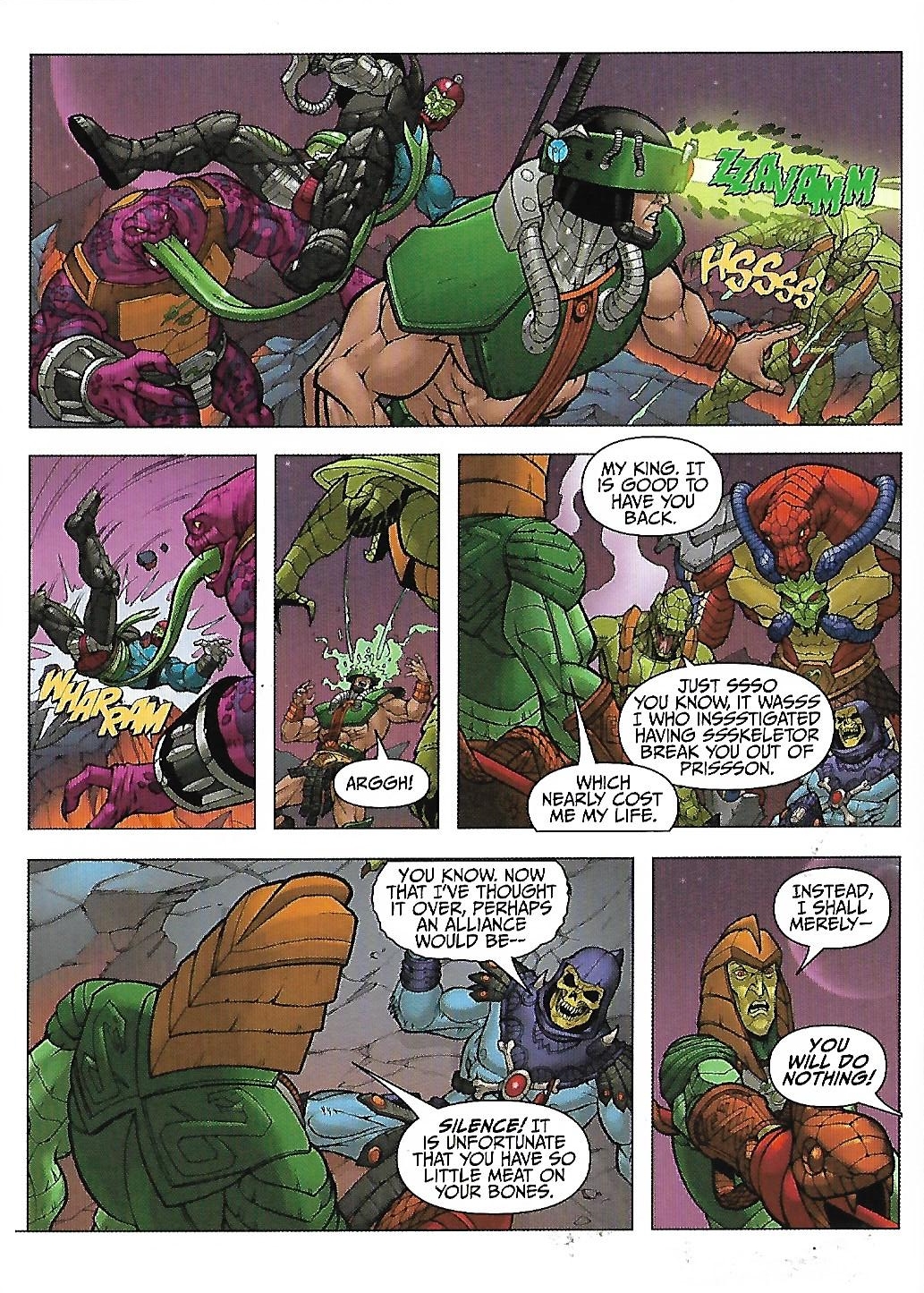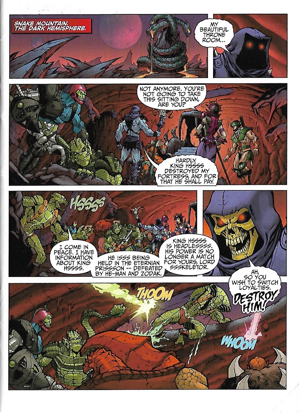 The comic picks up right where the 39th episode left off with King Hssss defeated by Zodak and He-Man, and King Hssss' main head destroyed. Imprisoned by Man-At-Arms in a new prison, the leader of the Snake Men is not rescued by his own forces but is liberated by Skeletor's henchmen, so that Skeletor may have revenge.