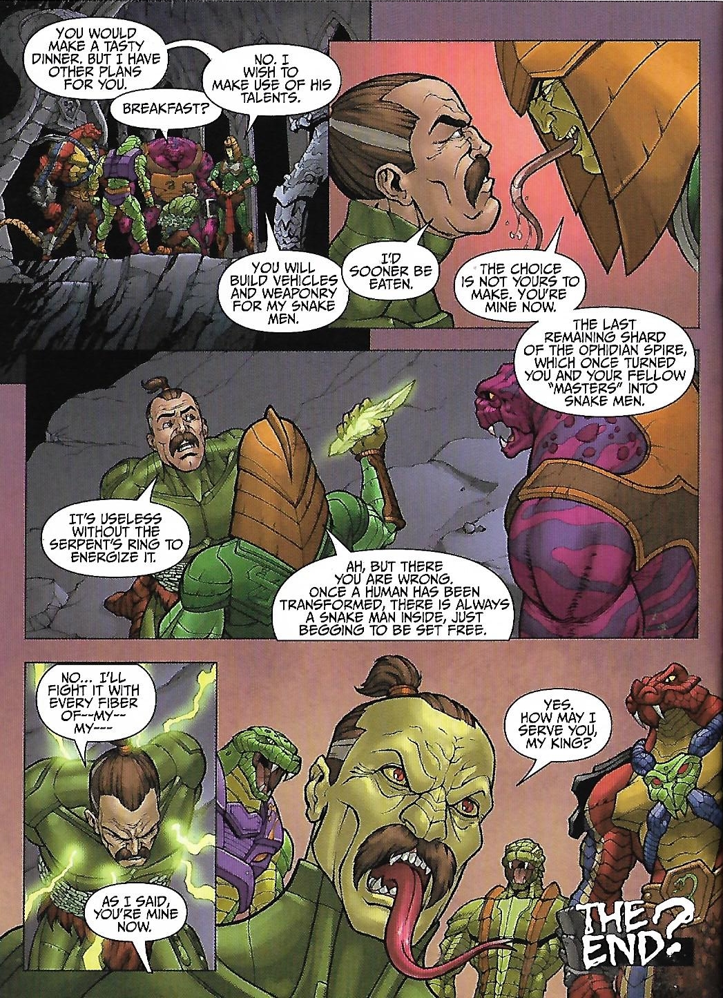 The comic also shows a major plot thread going forward, that has become a significant staple in He-Man fiction. It is included even in the Tim Seeley written Dark Horse / Matty Collector comics from 2012 and the upcoming Mondo exclusive figure, that of Man-At-Arms as a Snake Man.