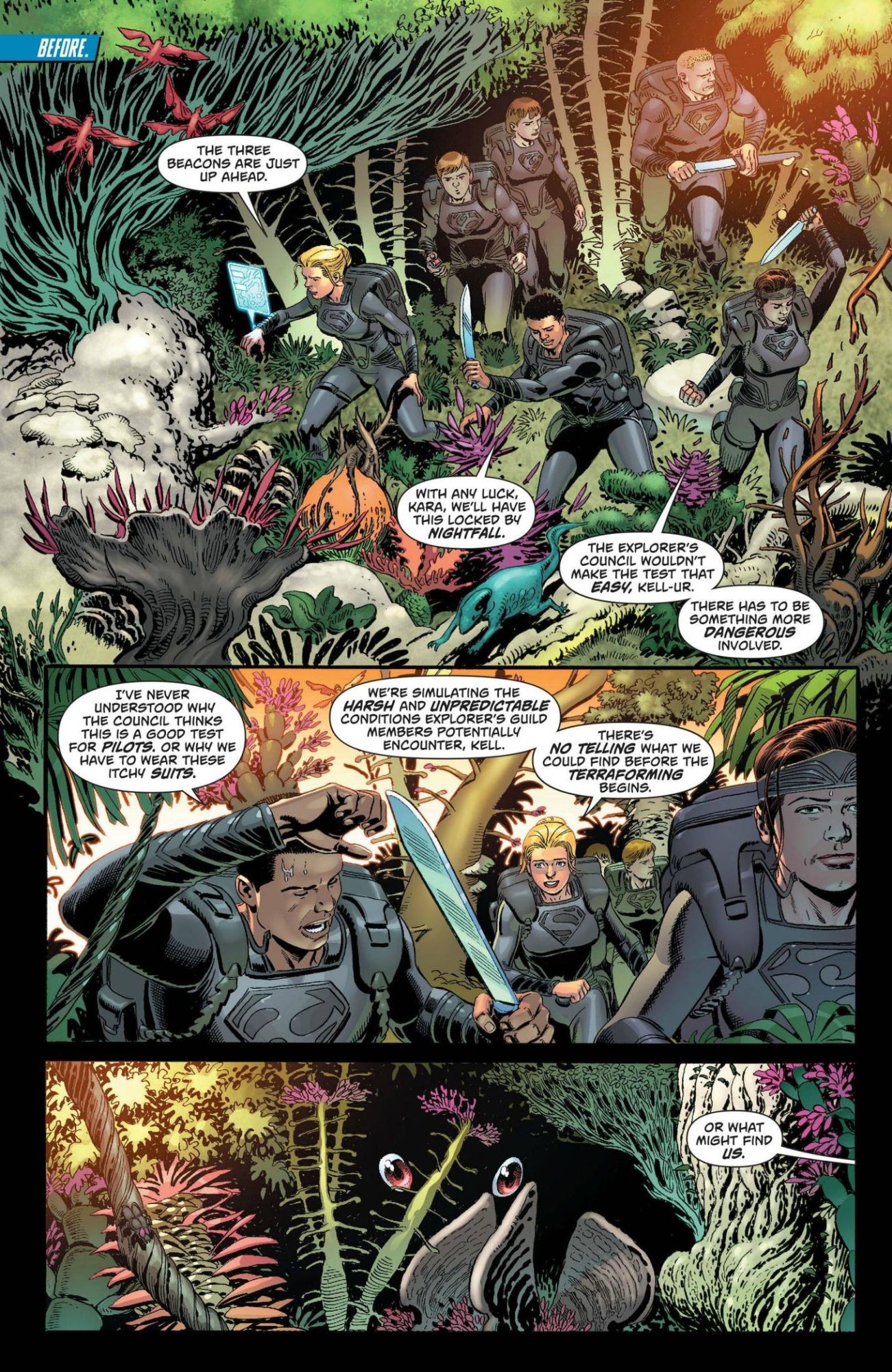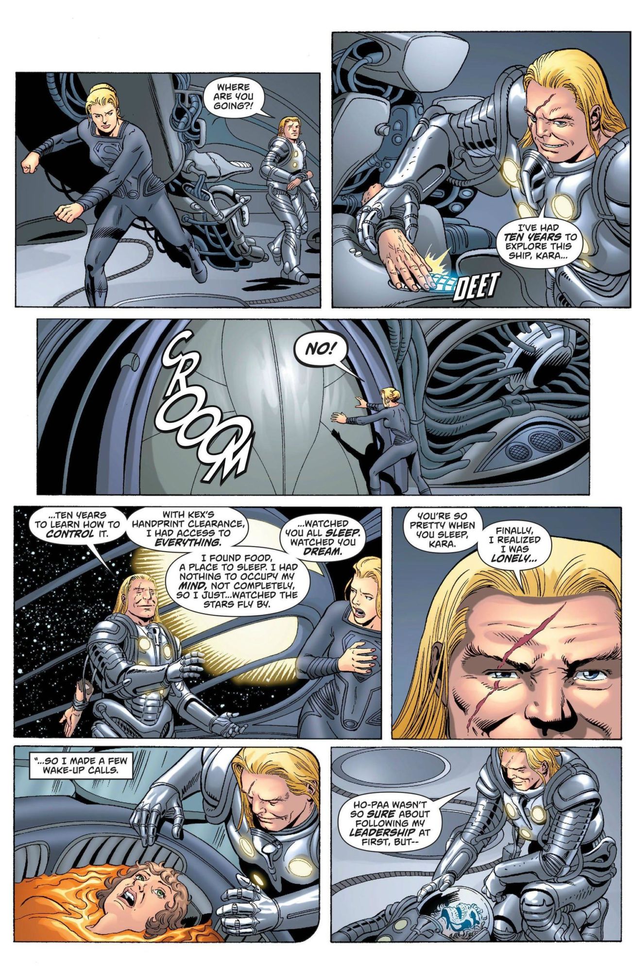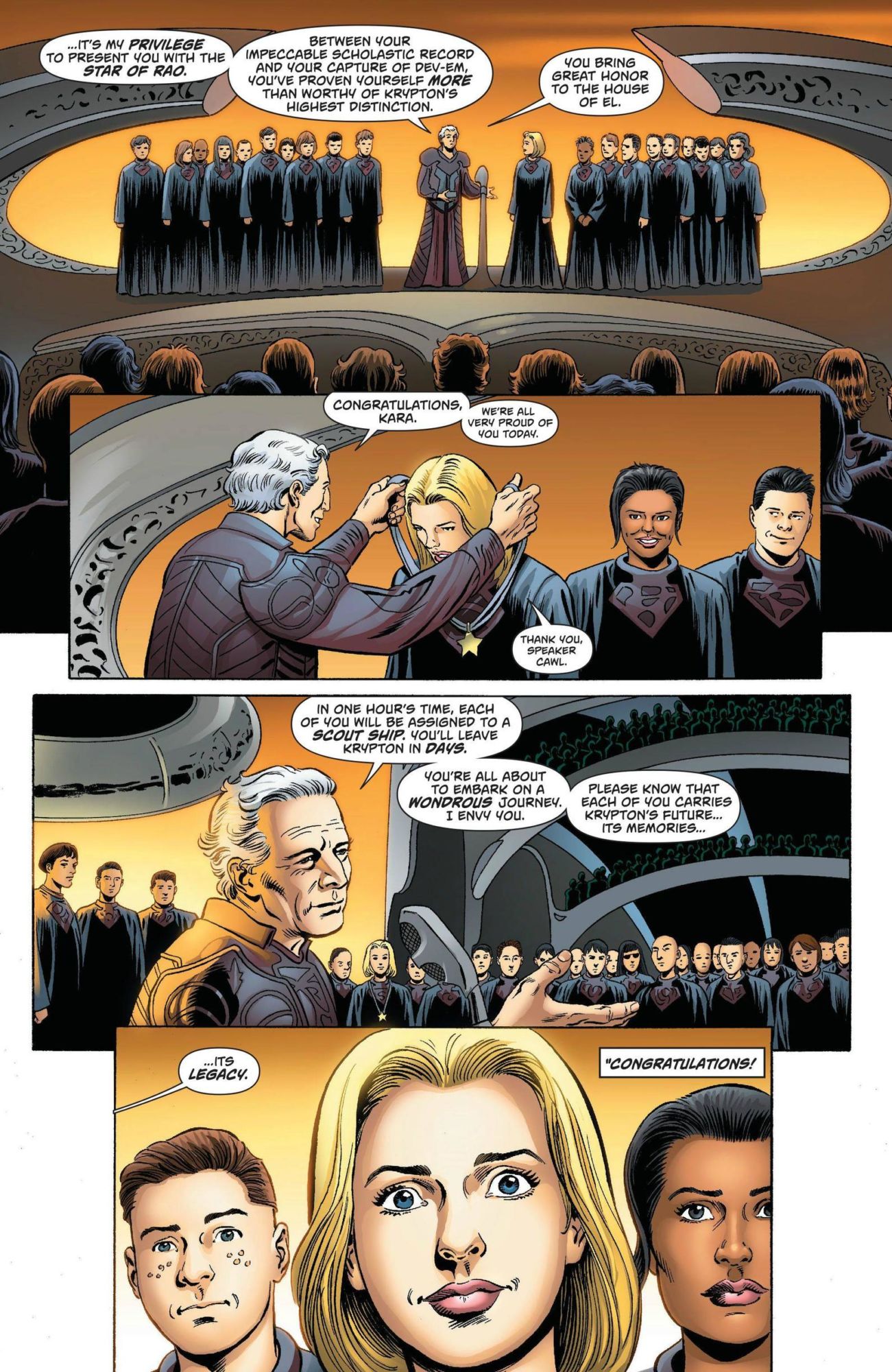 Kara graduates and shows off her ship to her parents, explaining that the ships will explore the galaxy, finding appropriate planets, landing, and then using a codex to then birth and grow an entire Kryptonian population to help them terraform. Kara and her crew leave Krypton, looking to discover and explore the known universe. The whole crew enters suspended animation for ten years in order to travel the long distance to a planet they hope to explore.