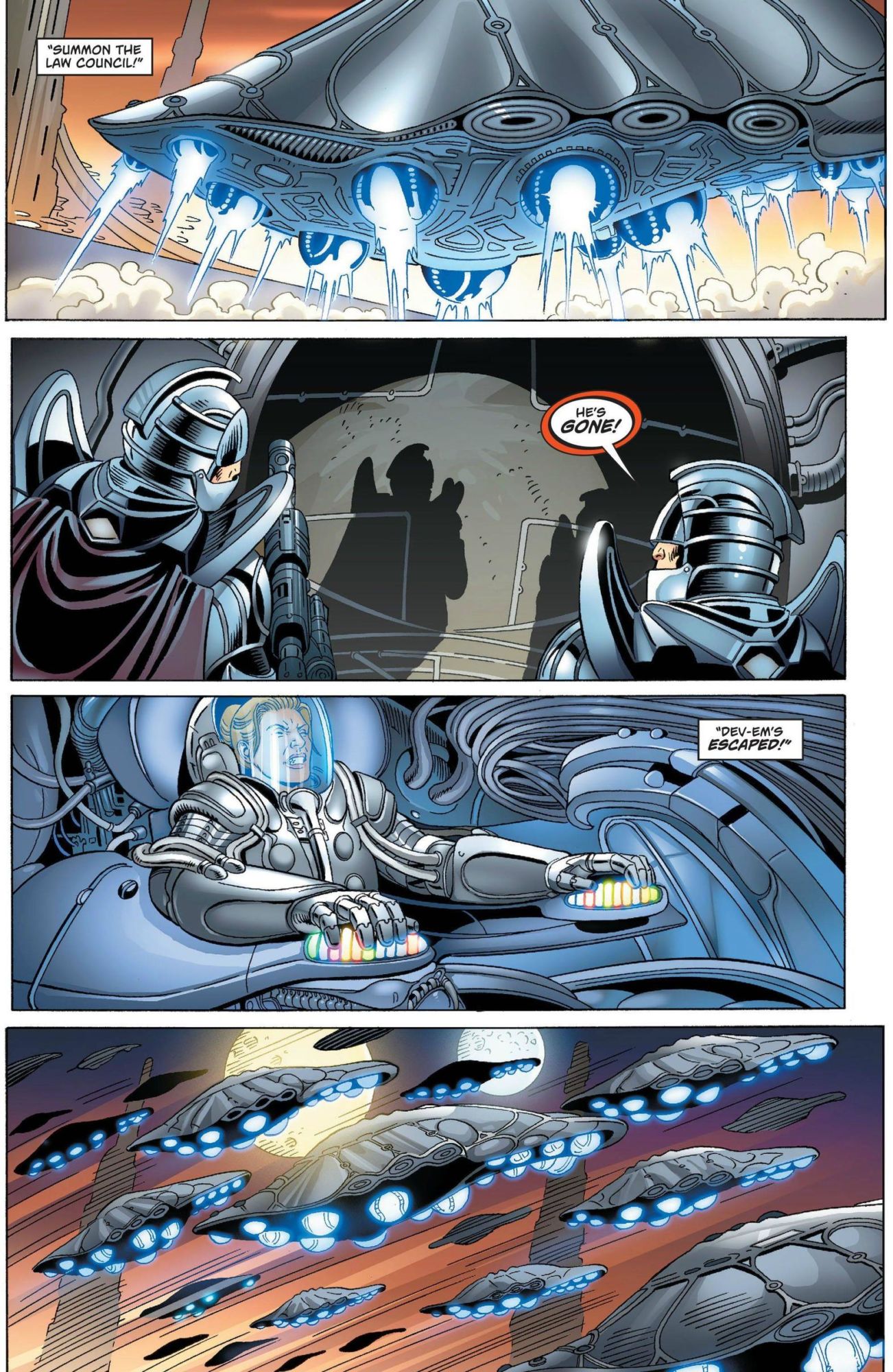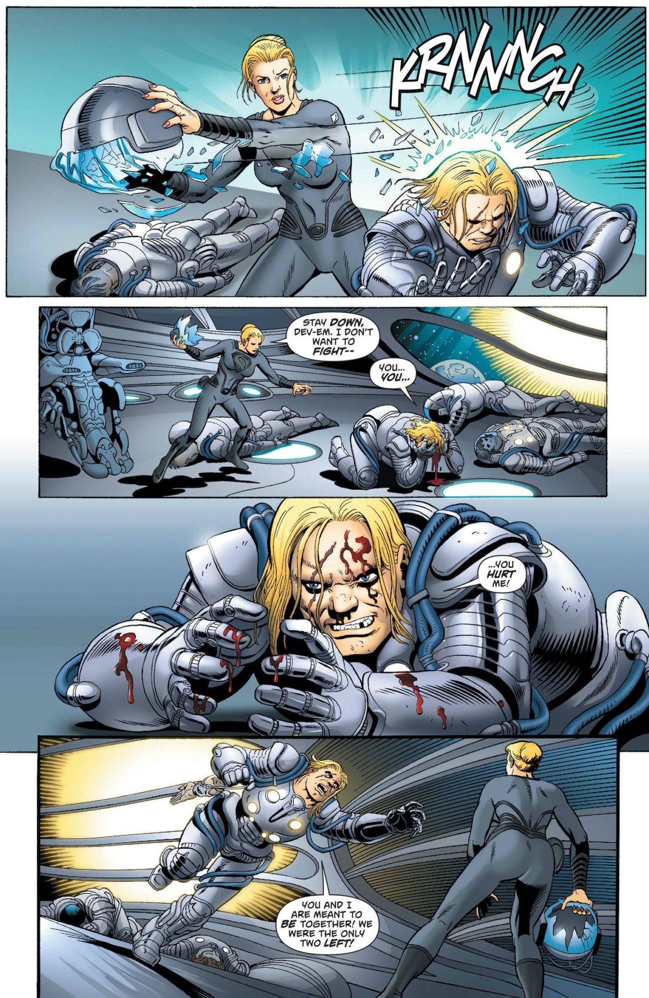 Waking up ten years later, Kara finds that Dev-Em is aboard, and he murdered everyone but herself, in hopes of still claiming her as his own. A fight ensues, and both find their strength has increased greatly. The ship with no pilot though sinks into the orbit of a planet and crashes, with only one emerging from the ship alive, who in shadow walks away into a snowstorm a thousand years ago in the Arctic.