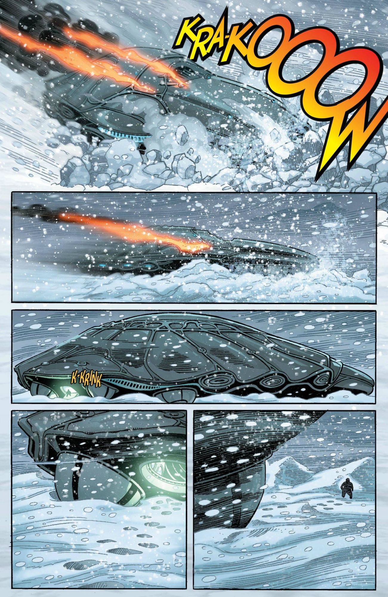 Present-day, the ship, buried deep under the ice, has repaired itself enough to activate a beacon, drawing the attention of the United States Government and Clark Kent.