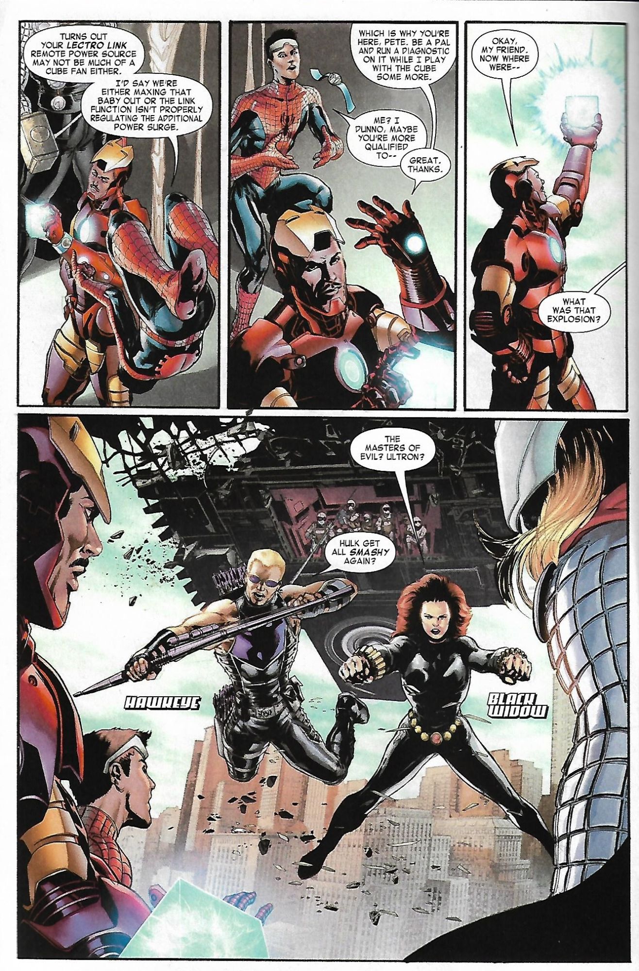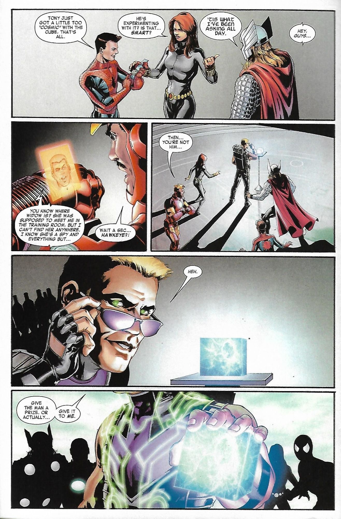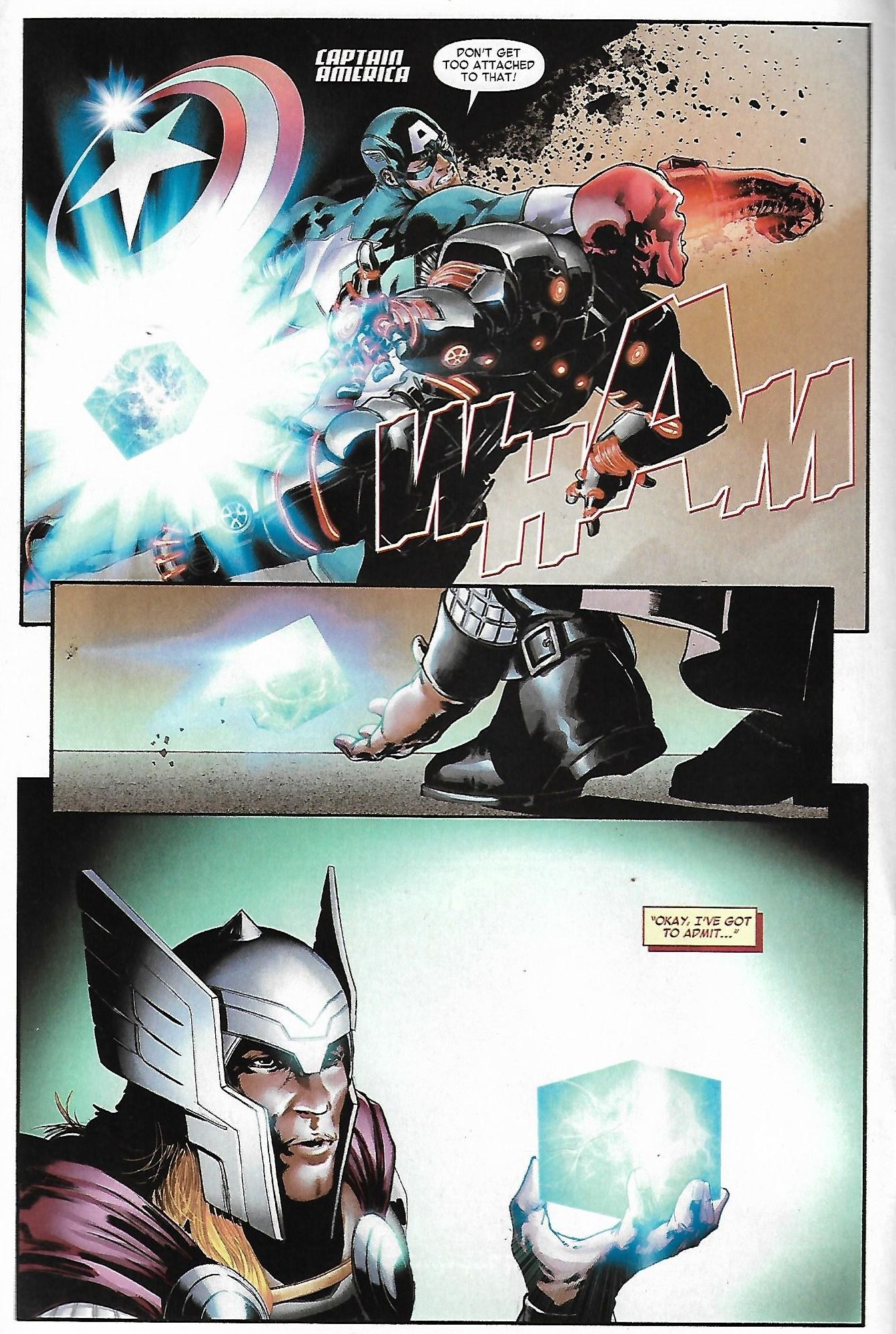 Working off a mostly 616 universe style, the comic starts as the defeated Avengers rally against the Red Skull and wrest the Cosmic Cube from him. Enlisting Spider-Man to help him analyze the Cube, Iron Man works to understand its power, as Thor worries about anyone possessing that much power.