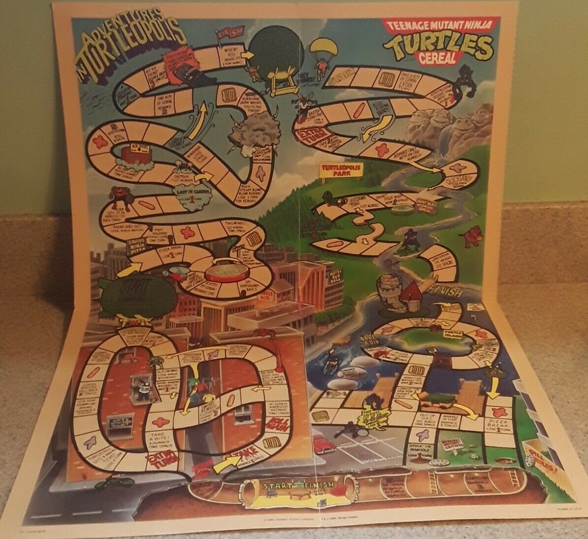 The TMNT cereal itself described itself as "crunchy, sweetened 'ninja nets' with 'ninja turtle' marshmallows" and went through numerous promotions from its shelf life of 1989 to 1995. Promotions included pizza-shaped marshmallows, TMNT cereal bowls, trading cards, and two collectible four-part board games.