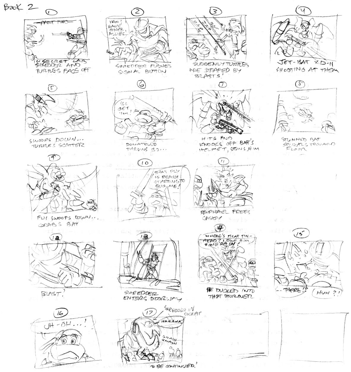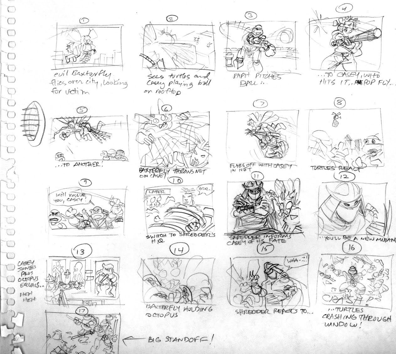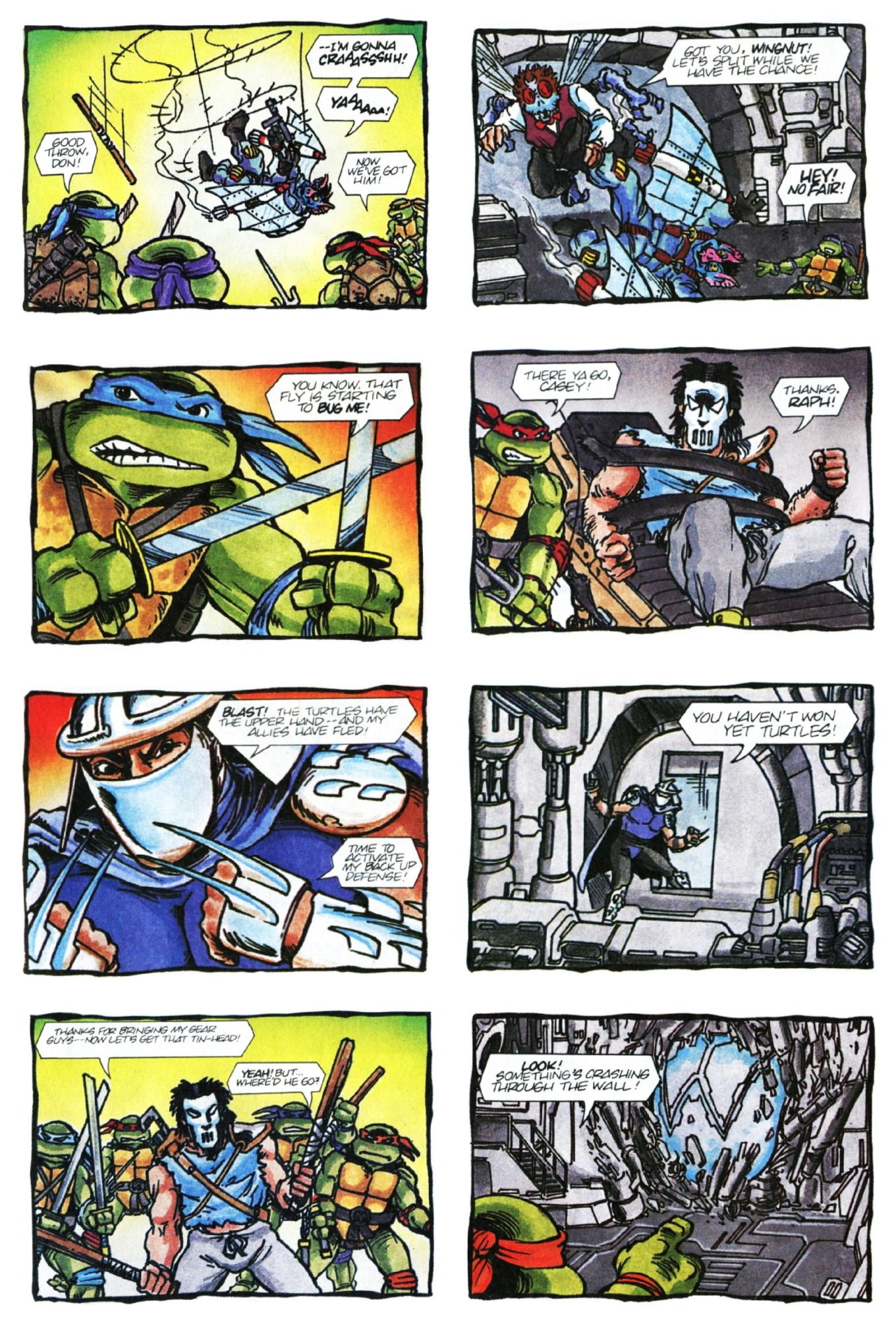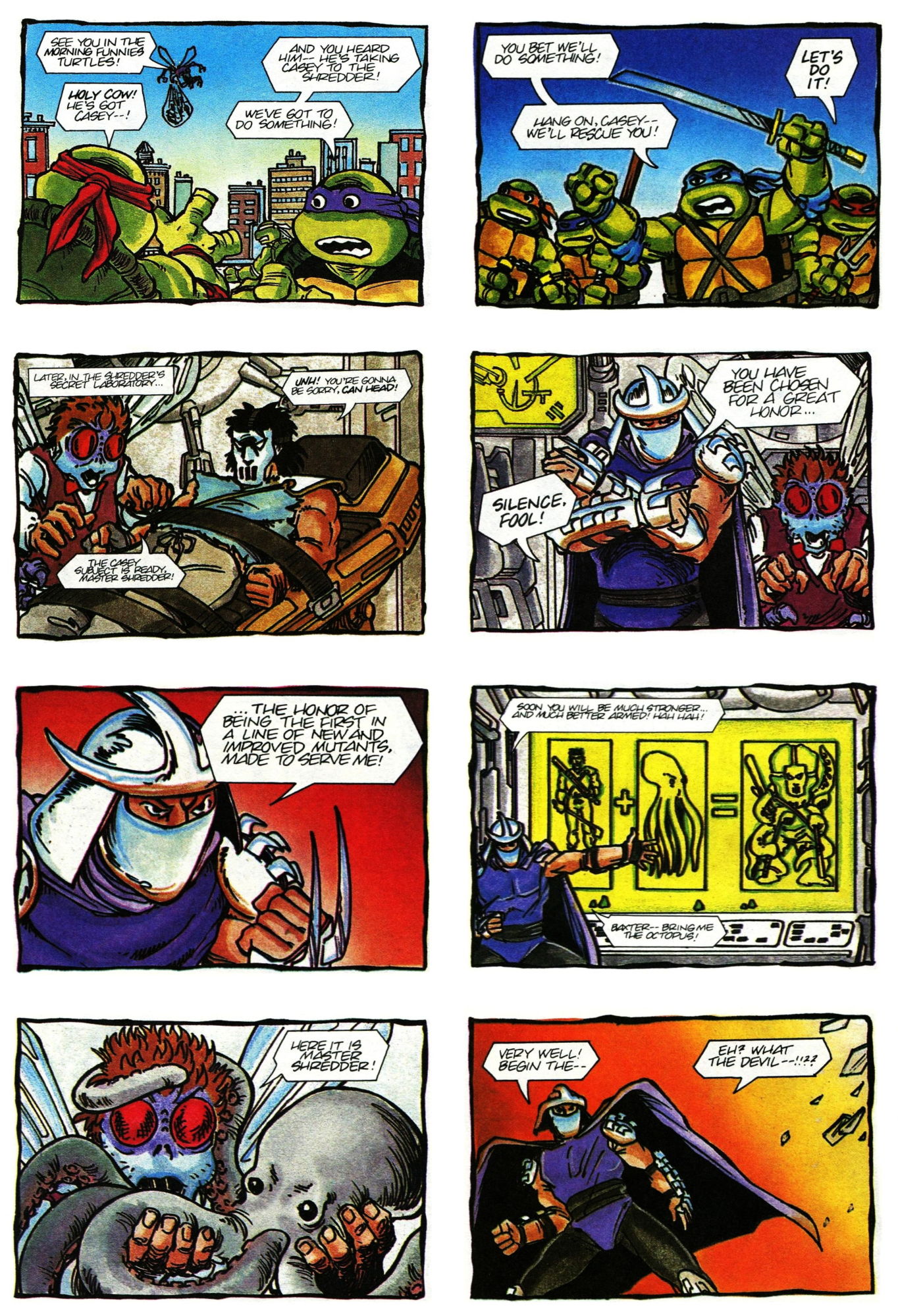 Issue 1 begins with Baxter Stockman, at this point a mutated humanoid fly, sent by Shredder to capture Casey Jones. Playing baseball on a rooftop with the Ninja Turtles, Casey is abducted by Baxter in a net and taken away to the Shredder's hideout. Informed that Shredder plans to mutate Casey Jones using an octopus, Shredder is stopped by the arrival of the Teenage Mutant Ninja Turtles.