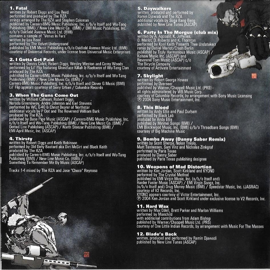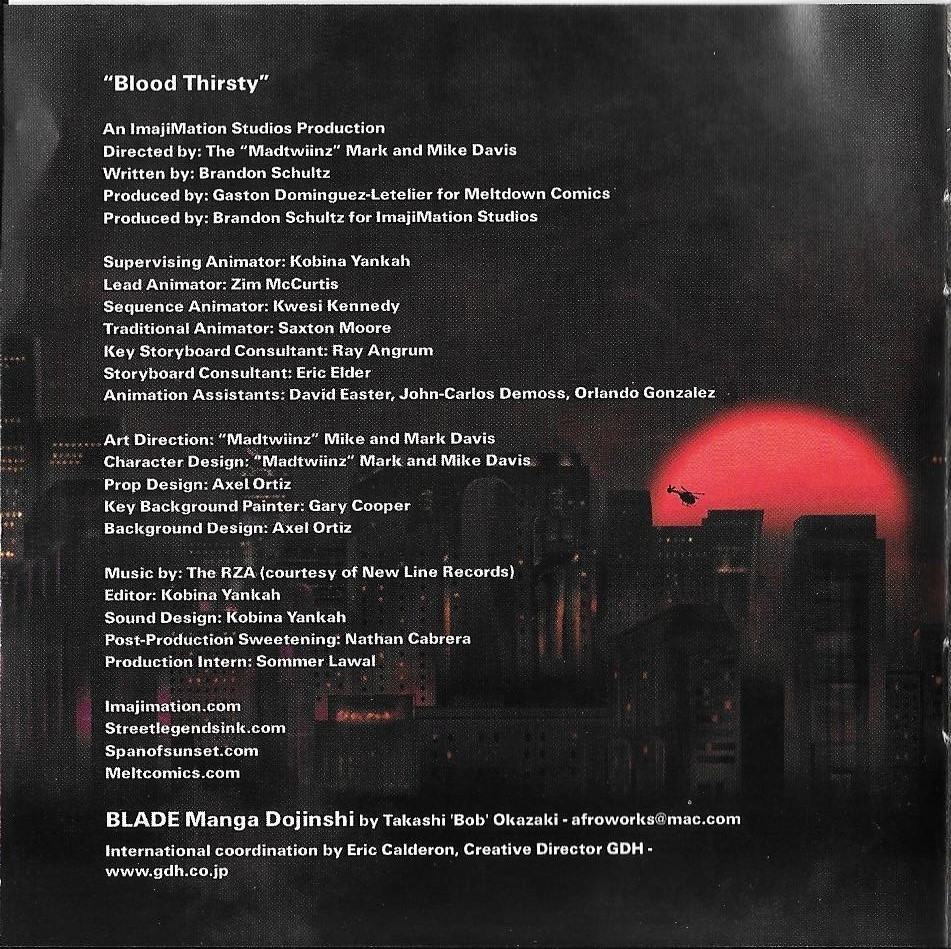 As mentioned, Blade Trinity was David Goyer's baby, and his personal interests spilled over into the movie's soundtrack. Bringing in Wu-Tang Clan leader RZA to work on the soundtrack, every part of the music involved RZA, including two non-music elements that spun off from the soundtrack. An almost 6 minute animated movie called Blade Blood Thirsty was made staring Blade and RZA from ImajiMation Studios and included on a separate DVD included in the Blade Trinity Soundtrack Deluxe Limited Edition. You can watch it here: