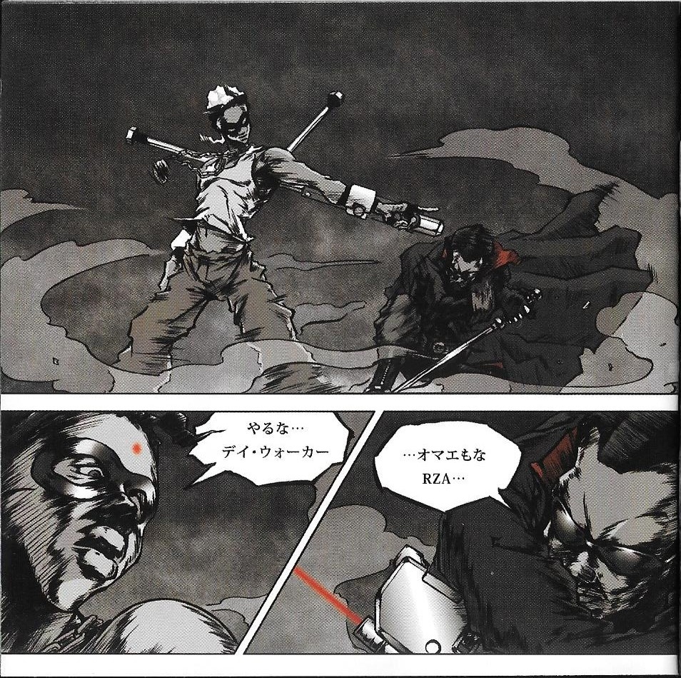 In addition, a separate eight-page dojinshi was commissioned from Takashi Okazaki, creator of Afro Samurai, and published only in the booklet for the Blade Trinity Deluxe Limited Edition soundtrack. The eight-page manga titled "Day Walker Vs. Vampire Hunter" features Blade versus RZA, until the two realize that they should fight together against the vampires after them. It was published untranslated and only in the soundtrack booklet making this comic more of a manga then dojinshi, though it is labeled as both strangely. It is an obscure comic that Marvel didn't publish, from the creator of both the doujinshi and anime series Afro Samurai (which not surprisingly the anime of involved RZA) doing some great short form work.