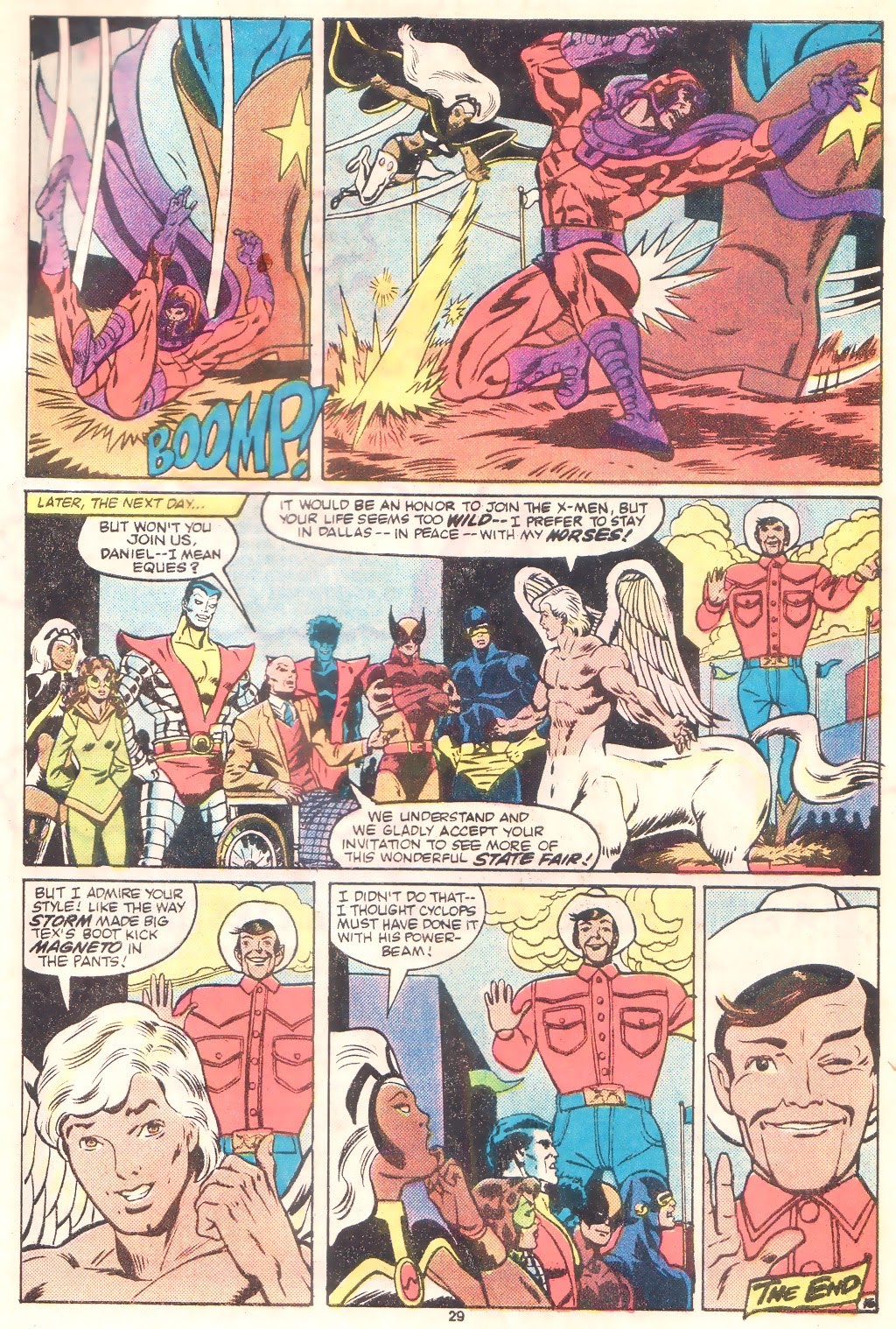 Nightcrawler tries to subdue Eques, while the rest of the X-Men are reminded they are dealing with the master of magnetism as both Wolverine and then Colossus are used as weapons against their own teammates. Magneto callously destroys the barn with Colossus' metal body, which angers Eques as Magneto almost kills the horses Eques cares about. With Eques against him, Magneto finds himself outmatched and then kicked by the boot of Big Tex, the fair's giant inanimate mascot, before he retreats. The X-Men invite Eques to train at Xavier's school, but he turns them down, more content to stay with his horses in Texas. Eques invites the X-Men to see more of the State Fair of Texas, but none of them can explain how Big Tex moved on his own, as the last panel shows Big Tex winking at the reader.