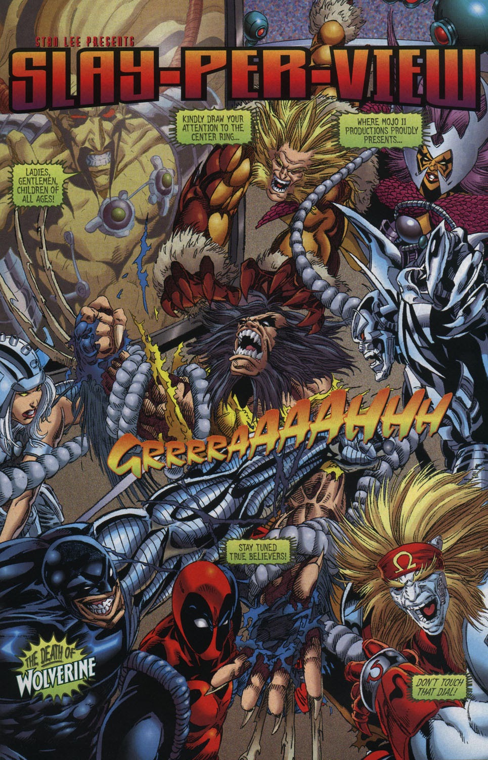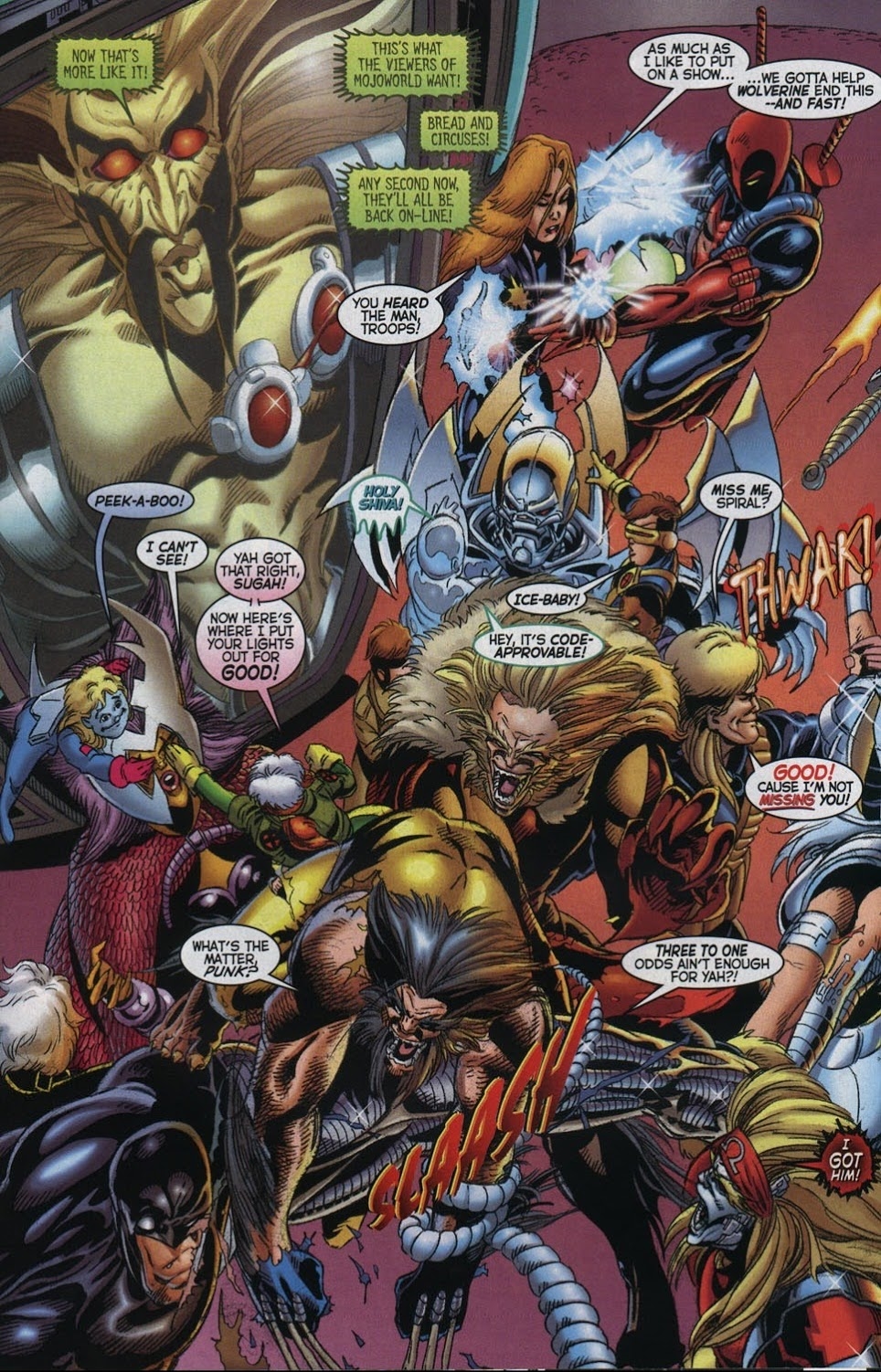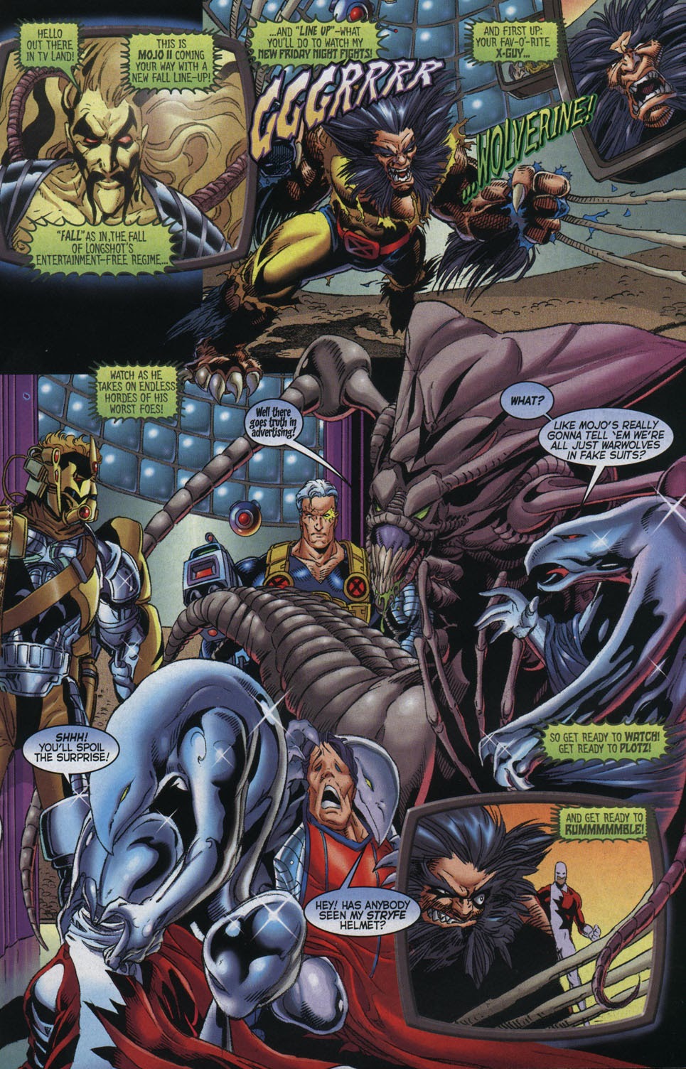 During this issue, Wolverine is tricked by Spyral and several Warwolves wearing X-Men skins to drop his guard, leading him to be abducted to the Mojoverse. Mojo II, in order to gain ratings and keep control, has the Warwolves don the appearance of all of Wolverine's enemies, from Omega Red to Sabertooth, to Deadpool, to the Thing, and even the Hulk, in order to create a non-stop brawl.