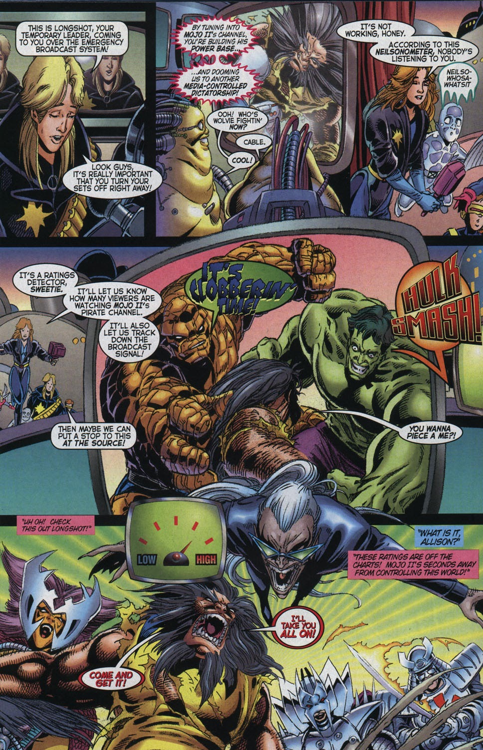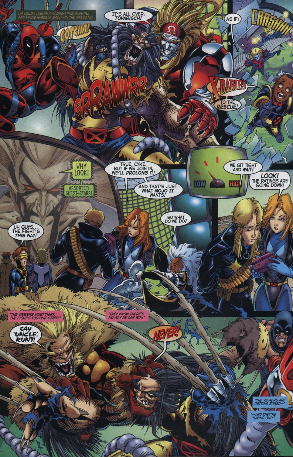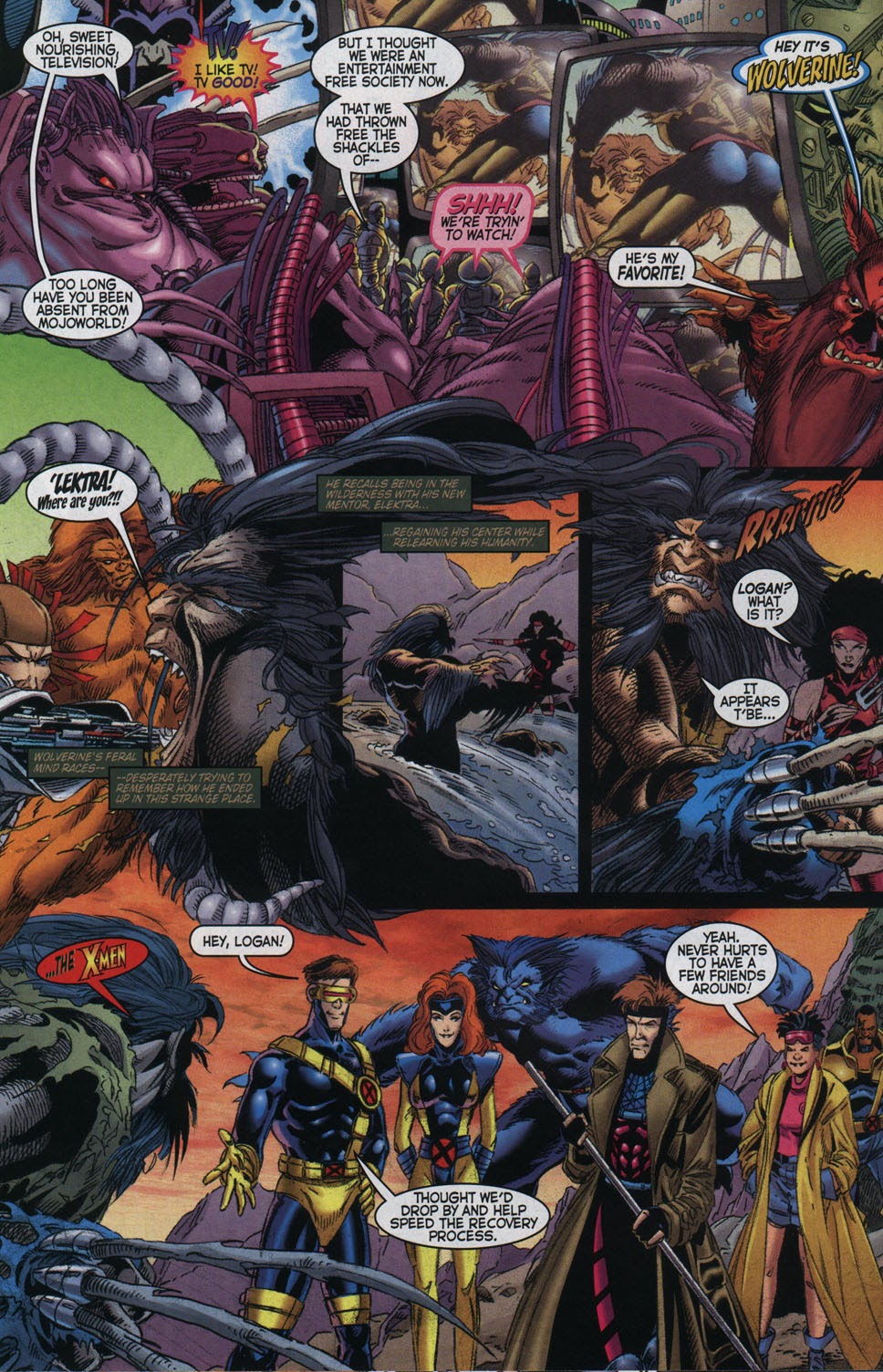 During this issue, Wolverine is tricked by Spyral and several Warwolves wearing X-Men skins to drop his guard, leading him to be abducted to the Mojoverse. Mojo II, in order to gain ratings and keep control, has the Warwolves don the appearance of all of Wolverine's enemies, from Omega Red to Sabertooth, to Deadpool, to the Thing, and even the Hulk, in order to create a non-stop brawl.