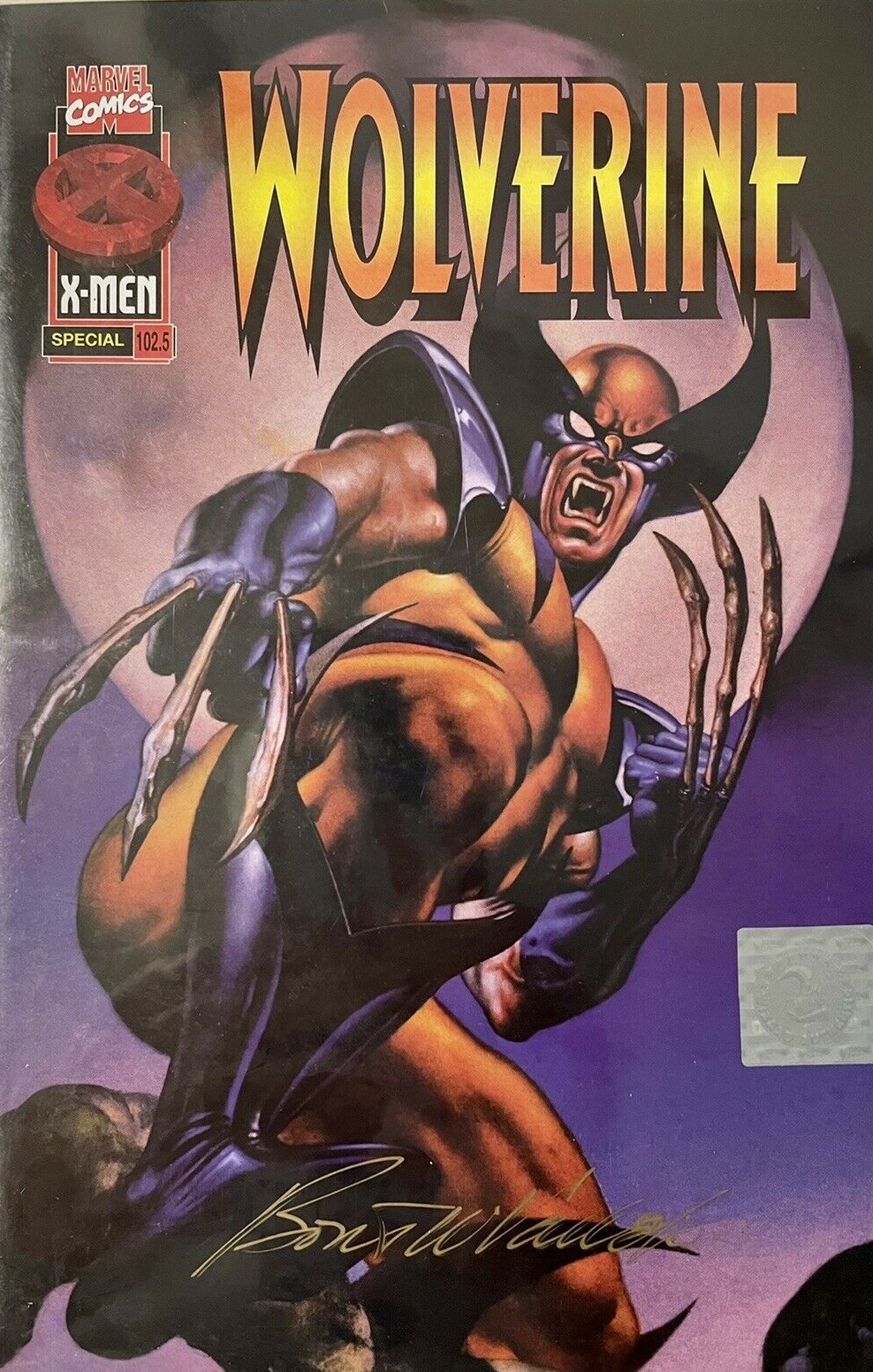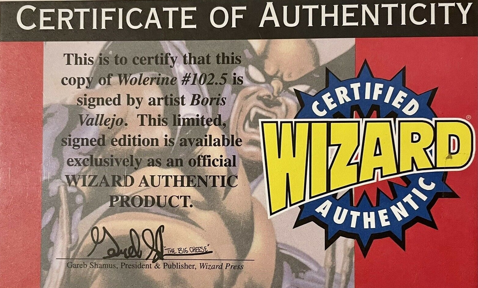 Readers most saw the original version on the backs of trading cards, but even a basic set of the 1996 X-Men Ultra: Wolverine Trading Cards can run between $100 to $200, not including any of the rare cards. The comic version, Wolverine #102.5, has two versions. The first was a mail–away Fleer special release, that is just the comic itself. Even in fine to very fine condition, this version can cost close to $100 or more. Then there is the Wizard exclusive version that was signed by cover artist Boris Vallejo and included an exclusive certificate of authenticity and holographic logo.