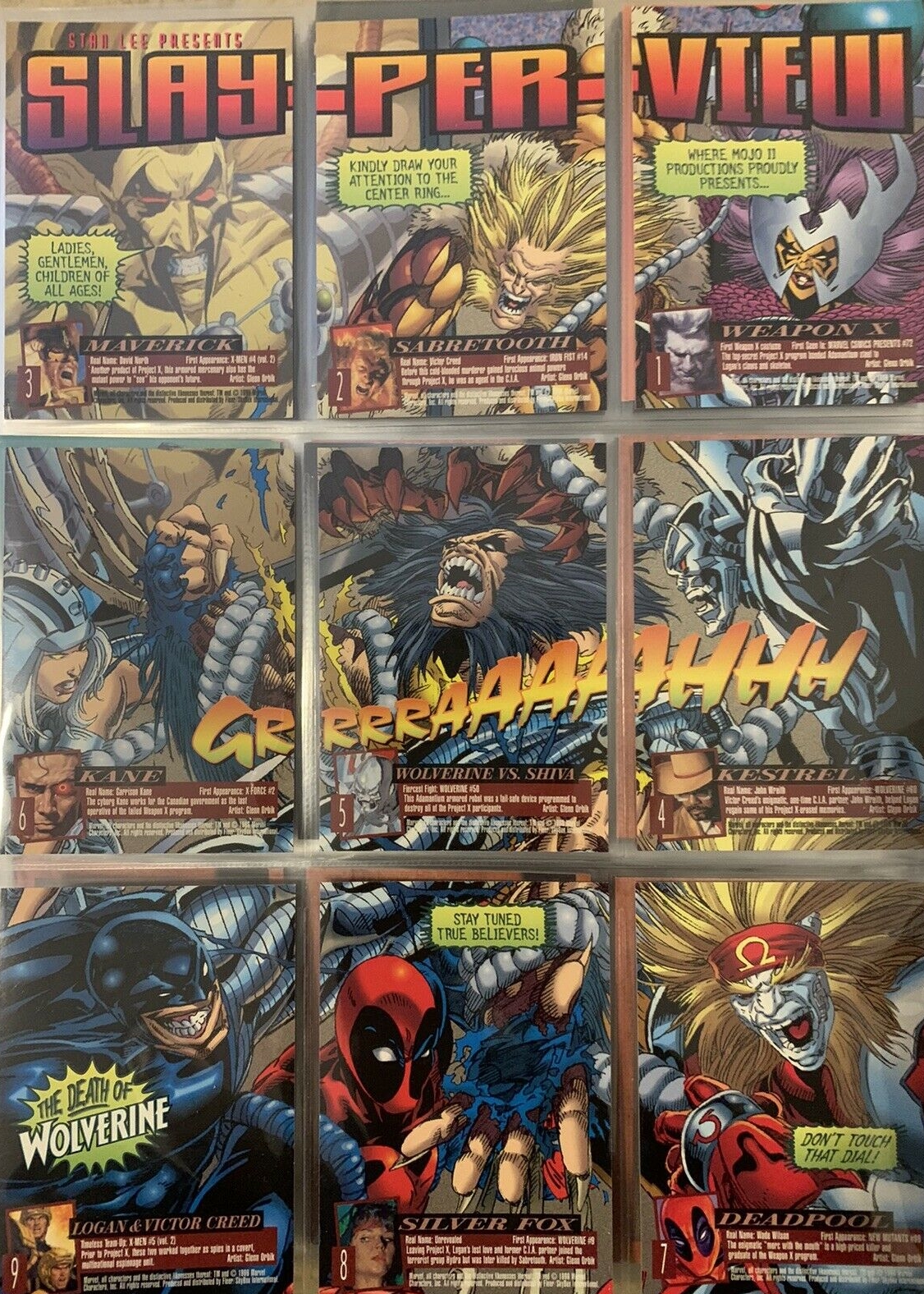 Written by Dan Slott, in one of his earlier writing gigs for Marvel, and drawn and inked by Fables legend Mark Buckingham, "Slay-Per-View" fits between issues #102 and #103 of Wolverine (Volume 1) published earlier in June and July of 1996. The story itself was designed to be printed on the backs of the first 99 cards in the 100 card set (with the 100th card being a checklist) so that it could be placed in nine hold trading card sleeves and read like a proper story.
