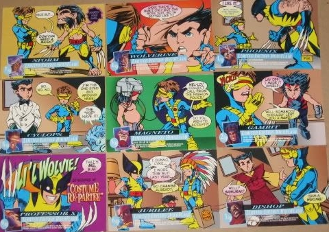 In addition, a holo-foil subset of 9 cards featuring a take on the scene from Fatal Attraction in X-Men (Volume 2) #25, where Wolverine has his Adamantium pulled loose by Magneto. by the Hildebrant brothers, was included as rare cards in the set. On the backs of those is a humorous take on Wolverine and his many looks, titled "Costume Re-Partee," written again by Dan Slott, and drawn by the late great Mike Wieringo, and was included as Page 12 in the comic.