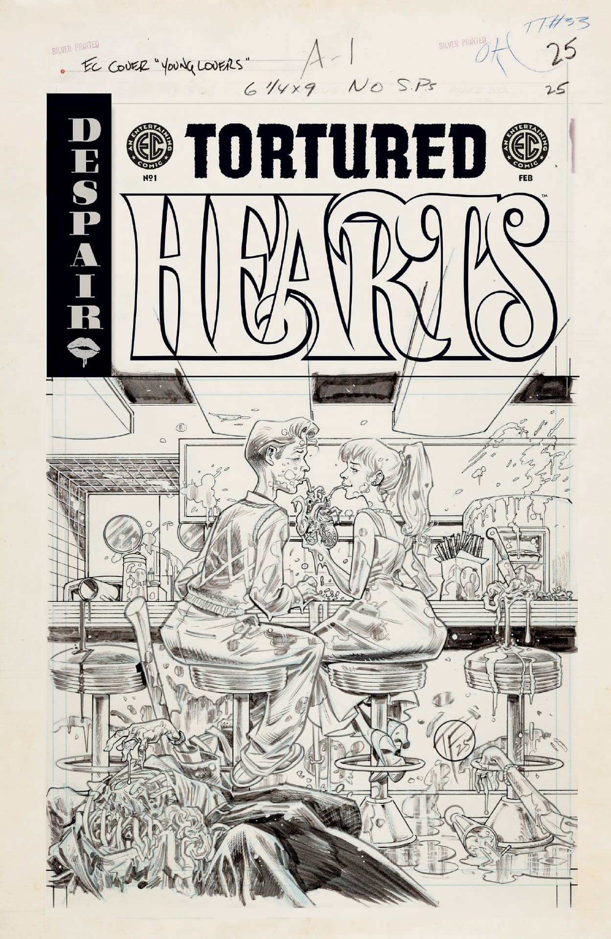 In the unrelenting tradition of EC Comics, here's one for all of you lovesick lunatics, rancid romantics, and forlorn fatalities as Oni Press proudly presents our next 56-page, coffin-shaped bouquet of brutality in TORTURED HEARTS #1—a giant-sized special full of soft whispers and death rattles from hot-blooded writers Jordie Bellaire (Redlands), Tini Howard (Excalibur) & Blake Howard (Vampire: The Masquerade), Ann Nocenti (Daredevil), and Amy Roy (EC's Epitaphs from the Abyss), alongside candy-coated artists Sebastián Cabrol (Hulk: Maestro), Fabiana Mascolo (Cyberpunk 2077), Dan McDaid (EC's Outlaw Showdown) and Arjuna Susini (Lamentation)!