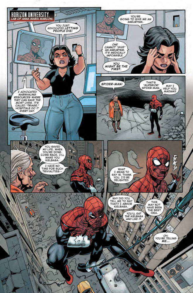 Marvel Comics publishes so many Spider-Man comics — more than 20 in June — that it can be hard to keep track of who's who. Most of them star Peter Parker, alternate versions of Peter Parker, or past versions of Peter Parker, but Superior Spider-Man actually stars Otto Ocatavius, or is that the consciousness of Otto Octavius in a cloned body? Something like that, we're pretty sure. In this preview of Superior Spider-Man #4, Otto is recuperating from his latest battle with Terrax while trying to hook up when he's rudely interrupted by Anna Maria….