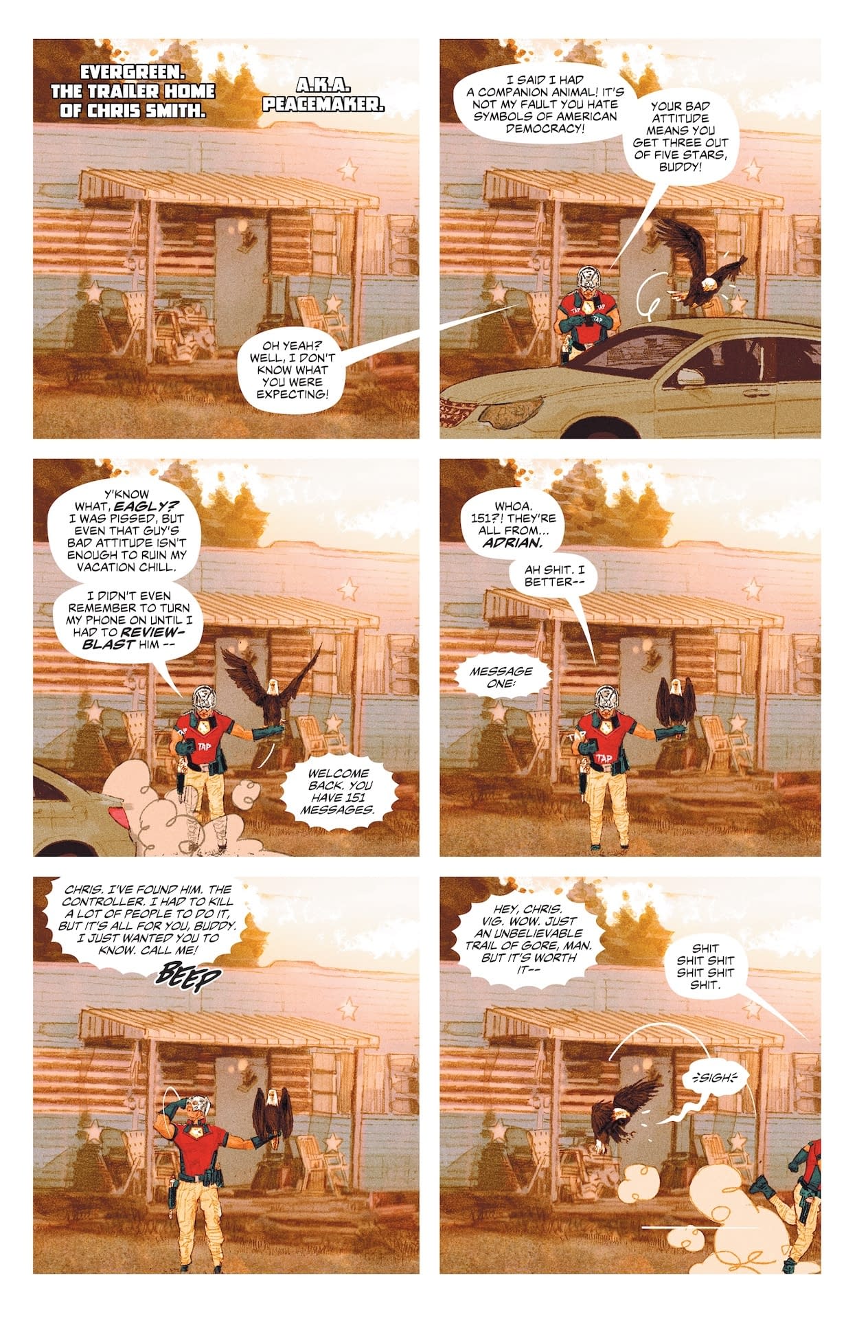 PEACE HAS NO END! DC Studios' James Gunn steps in as story consultant for five issues of insane $%&!@#$ calamity when two fan-favorite characters share the spotlight (and equal page count)! We start the end with the best news ever: Daddy's home! Peacemaker is back in Evergreen–just in time to see what Adrian has done to the place. The real villains are revealed! Just who is the Controller? Why is this story about scented condoms? Who okayed this?! Meanwhile, nudity! Bad language! Ultra-violence! An eagle that kicks all the %#$! This book has it all! Plus, we're at the end of the line, folks. This is it. The last story! Can Eagly and his pet Peacemaker survive the long game of an assassin with a bone(r) to pick? I don't know. I haven't read this issue yet. But you should. I'm outta here. I need to go have a snack and watch Real Housewives of Beverly Hills. Those ladies are the worst. (And by worst, I mean best.) The final installment of the original DC Comics story inspired by James Gunn's visionary Peacemaker series on Max!