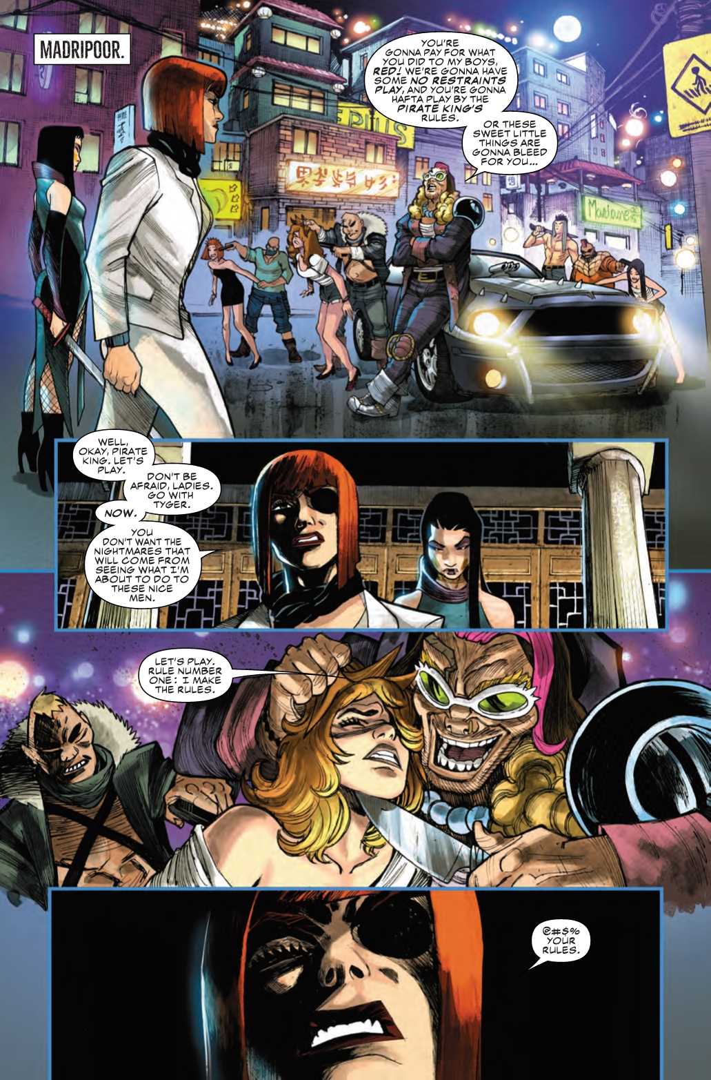 Black Widow's new solo series continues with its second issue next week as Natasha works on cleaning up the streets of Madripoor, starting with the Pirate King, who thinks he can boss her around as long as he's holding some local prostitutes hostage. But as it turns out, the Black Widow, free of the pesky rules and constraints of acting as an Avenger, has a lesson to teach the colorfully-dressed Pirate King that fans of WWE during the Attitude Era learned early on: pimpin' ain't easy!