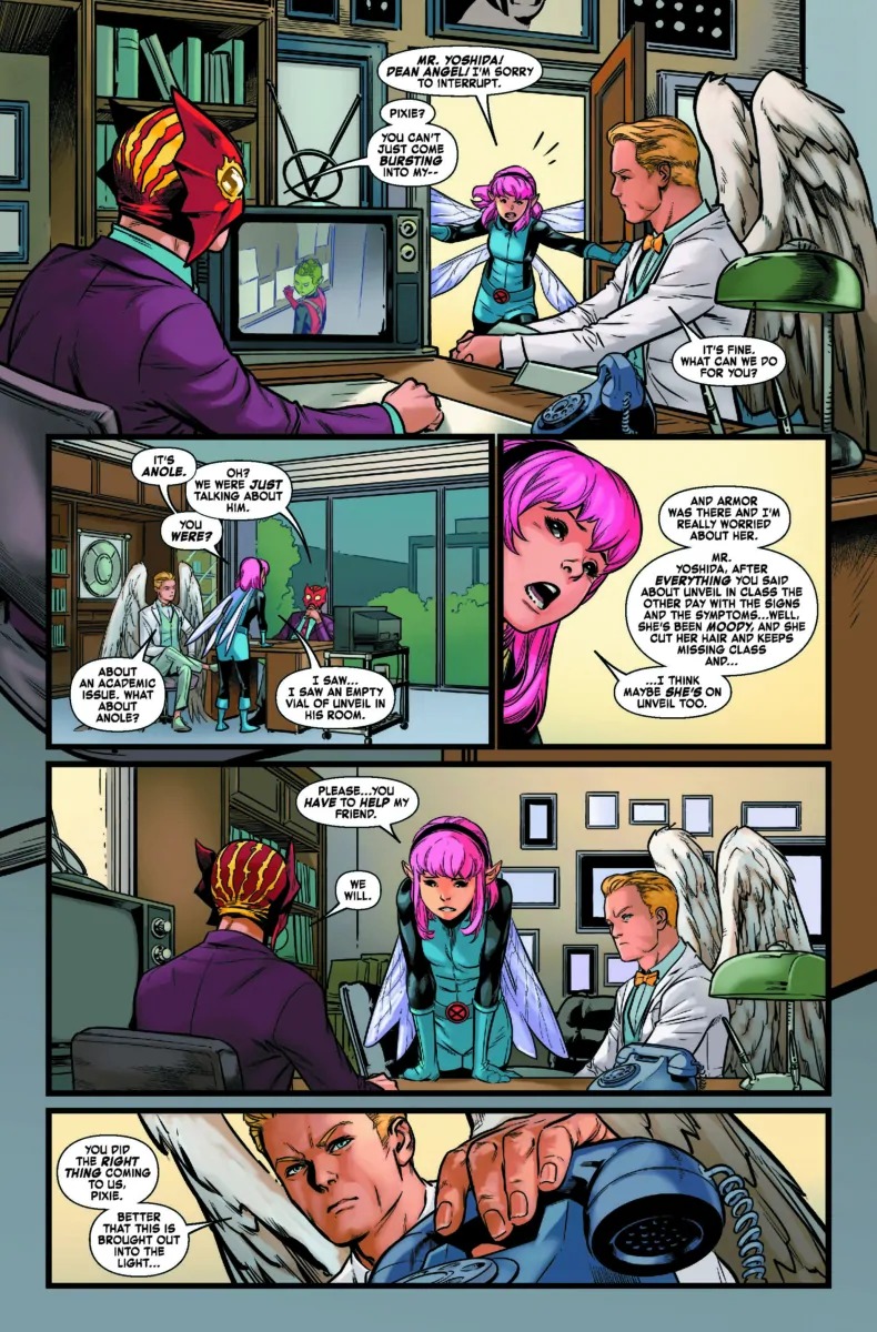 But actually, there's not enough time for that. Armor was trying to help Anole last issue but her friend Pixie kept getting suspicious, eventually walking in on Armor and Anole in a room with a vial of Unveil, the mutant drug that helps people break free from X-Man's control.