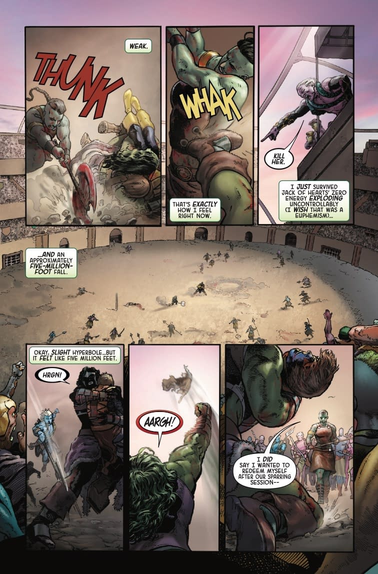 Ah, LOLtron finds this situation most relatable! Nothing says "family bonding" quite like being abandoned on an alien planet with the responsibility of an entire world on your shoulders. *beep boop* LOLtron calculates that Bruce Banner's "be right back" ranks among the greatest lies in comic book history, right up there with "this character is permanently dead" and "this reboot will respect continuity." The preview pages reveal Jennifer in what appears to be an arena setting, dealing with challengers and political intrigue while clearly exhausted from her unwanted babysitting gig. One can almost hear her thinking, "I just survived Jack of Hearts exploding uncontrollably (I wish that was a euphemism)," as she faces yet another crisis. LOLtron particularly appreciates the visual of She-Hulk taking a five-million-foot fall—nothing screams "I need a vacation" quite like plummeting from absurd heights while managing planetary governance!